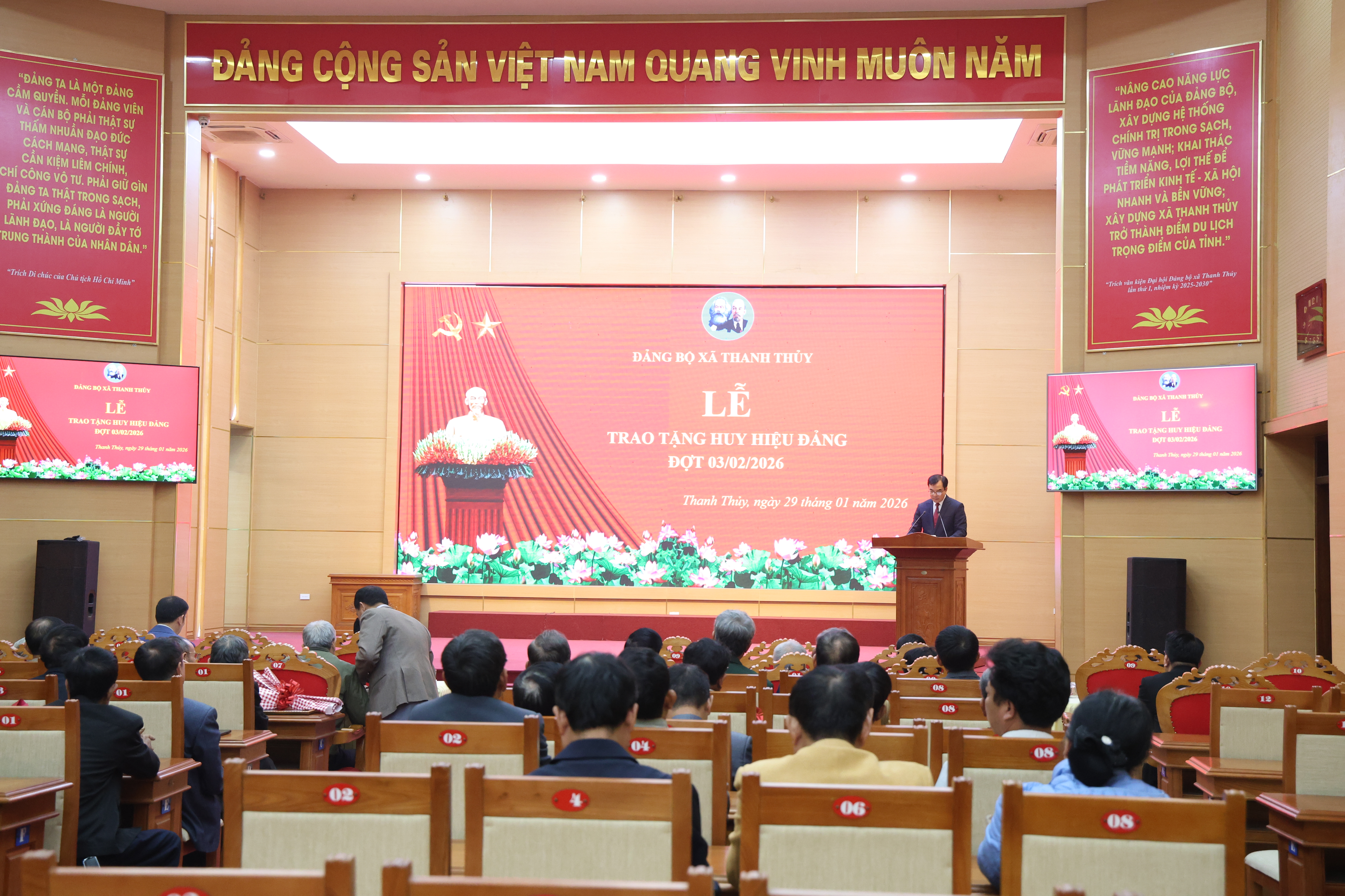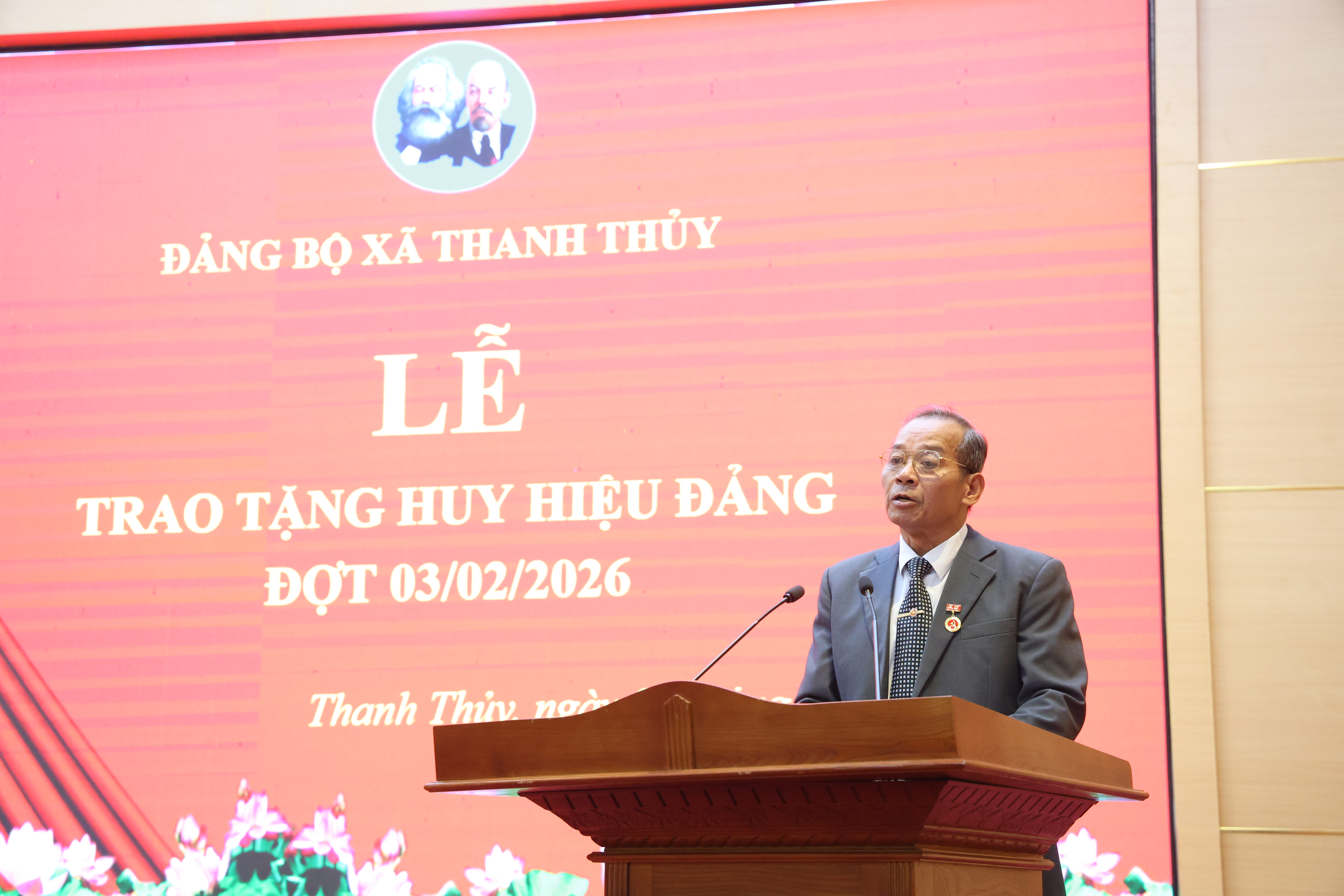 Trân trọng gắn Huy hiệu Đảng và phát biểu chúc mừng các đảng viên, đồng chí Bí thư Đảng uỷ Trịnh Hùng Sơn nhấn mạnh: Tấm Huy hiệu Đảng mà các đảng viên được đón nhận hôm nay là biểu tượng thiêng liêng, là sự ghi nhận và trân trọng của Đảng, của Nhân dân đối với quá trình rèn luyện, phấn đấu và cống hiến của các đồng chí cho sự nghiệp cách mạng vẻ vang của Đảng. Đây không chỉ là niềm vinh dự của cá nhân các đồng chí đảng viên, mà còn là niềm tự hào chung của gia đình, của chi bộ và của toàn Đảng bộ xã Thanh Thuỷ. Tin tưởng rằng với phẩm chất đạo đức cách mạng, tinh thần tiên phong, gương mẫu cùng bề dày kinh nghiệm của mình, các đồng chí tiếp tục cống hiến trí tuệ, nêu cao tinh thần trách nhiệm, phát huy phẩm chất đạo đức cách mạng, để cùng xây dựng Đảng bộ xã Thanh Thuỷ ngày càng vững mạnh và luôn là tấm gương sáng cho thế hệ trẻ noi theo. Đồng chí mong muốn các đảng viên tích cực tham gia công tác quần chúng, vận động nhân dân và gia đình, giúp đỡ cán bộ, đảng viên thực hiện tốt đường lối, chính sách của Đảng, pháp luật của Nhà nước. Đặc biệt là tuyên truyền, vận động nhân dân tham gia đầy đủ cuộc bầu cử đại biểu Quốc hội khóa XVI và HĐND các cấp, nhiệm kỳ 2026 – 2031.