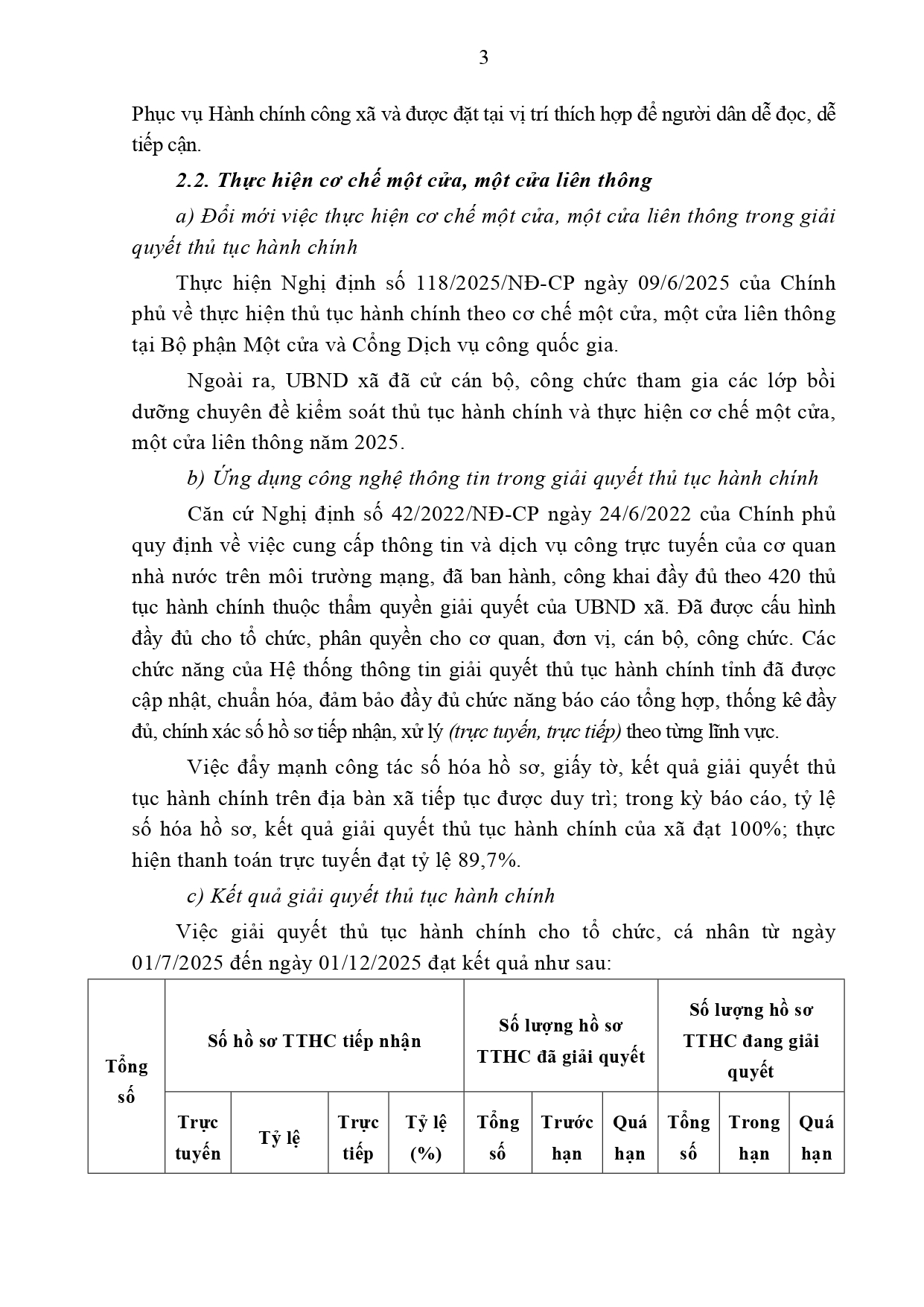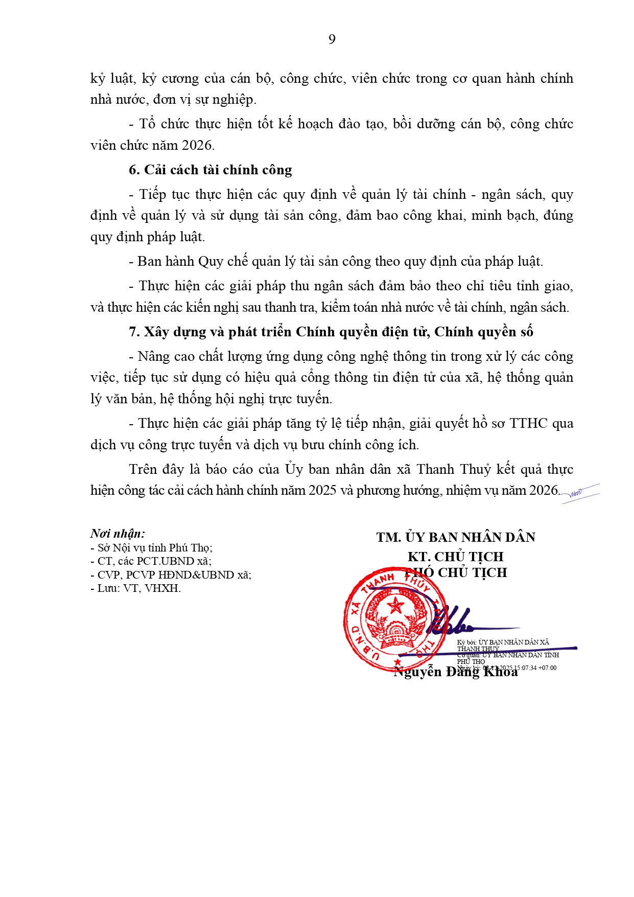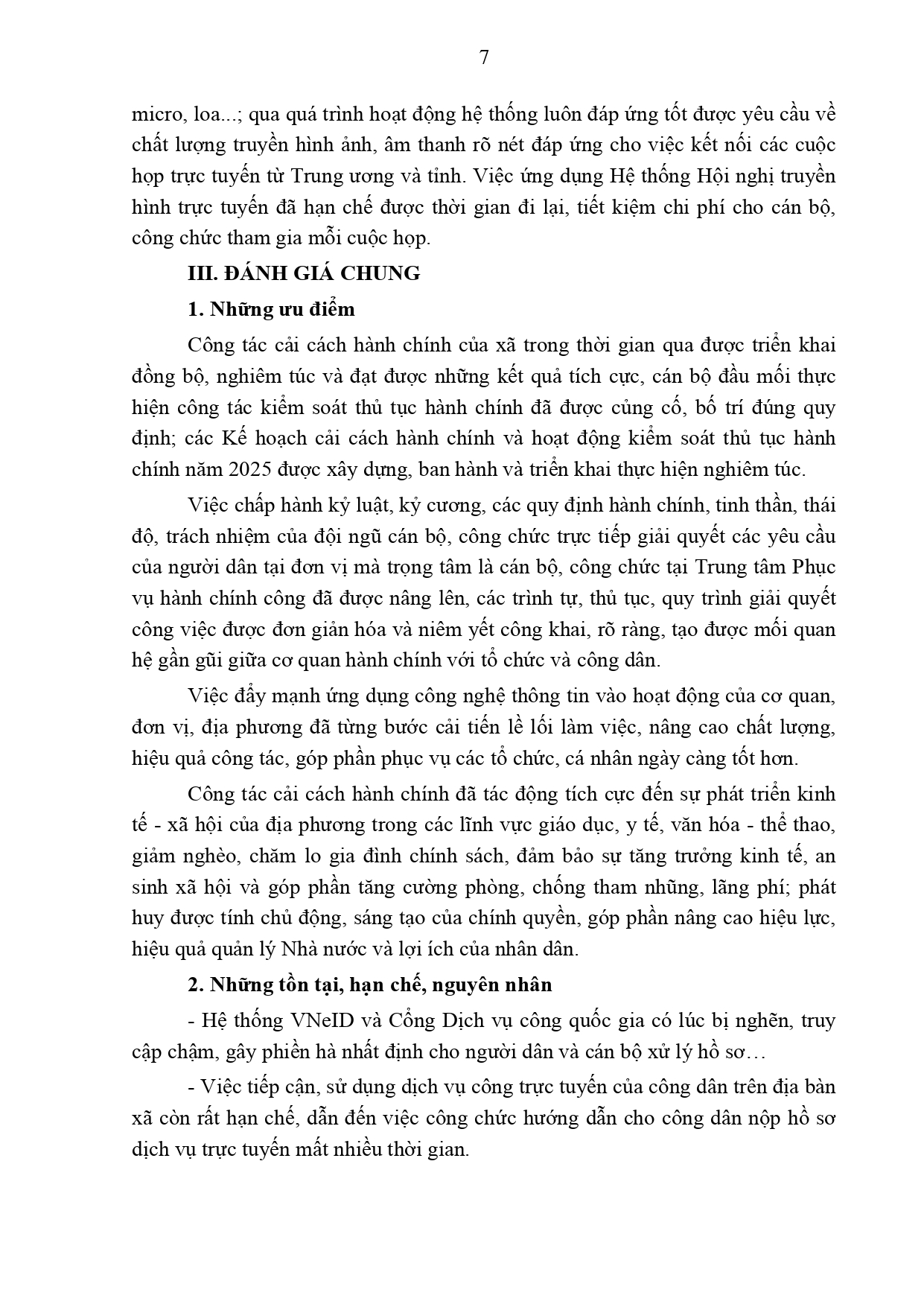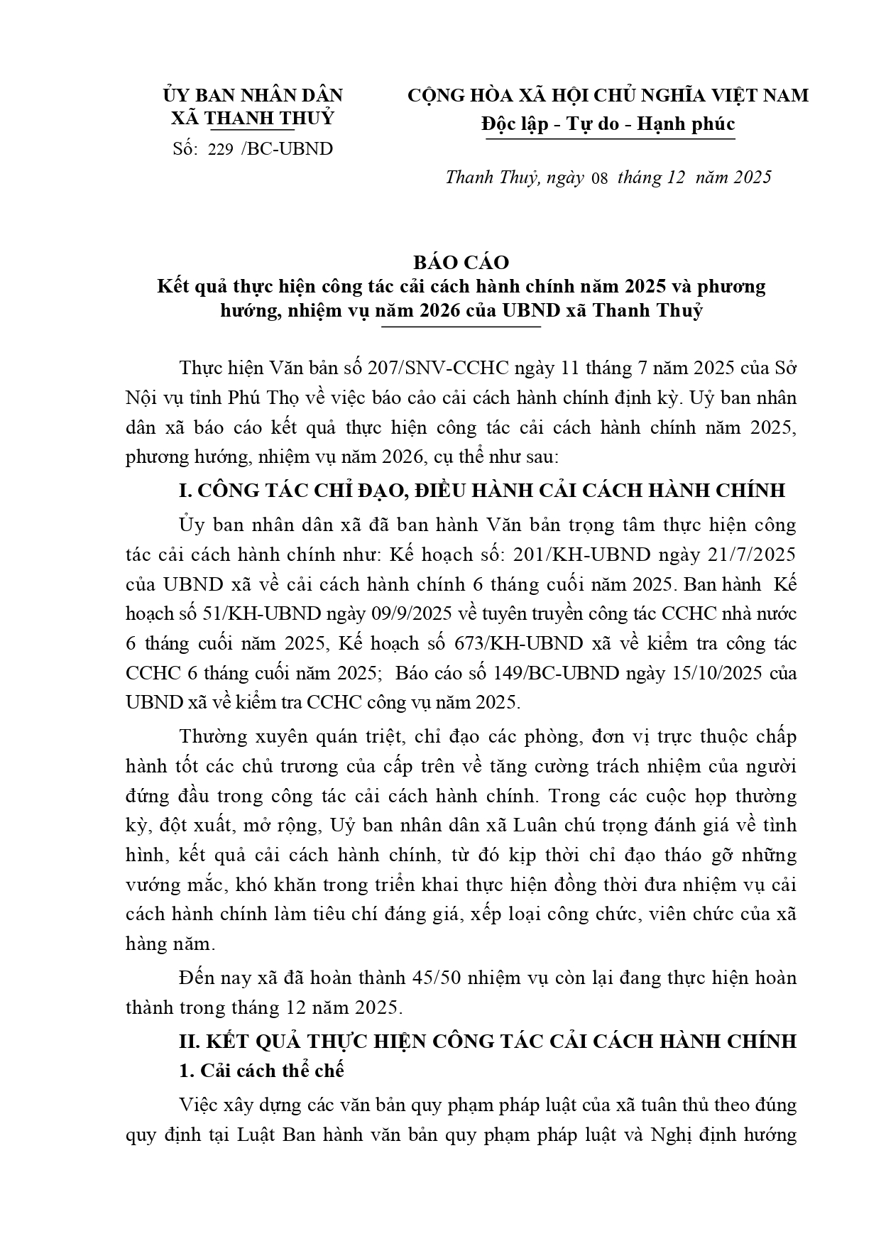 Thực hiện Văn bản số 207/SNV-CCHC ngày 11 tháng 7 năm 2025 của Sở Nội vụ tỉnh Phú Thọ về việc báo cảo cải cách hành chính định kỳ. Uỷ ban nhân dân xã báo cáo kết quả thực hiện công tác cải cách hành chính năm 2025, phương hướng, nhiệm vụ năm 2026, cụ thể như sau:
