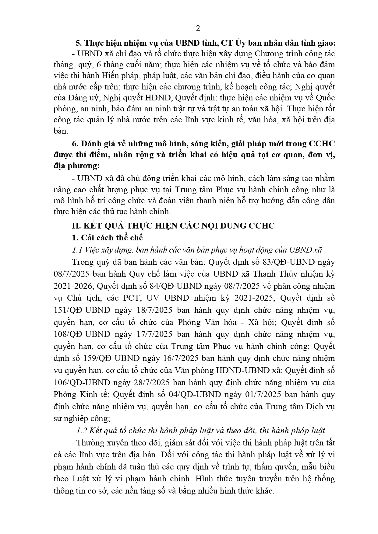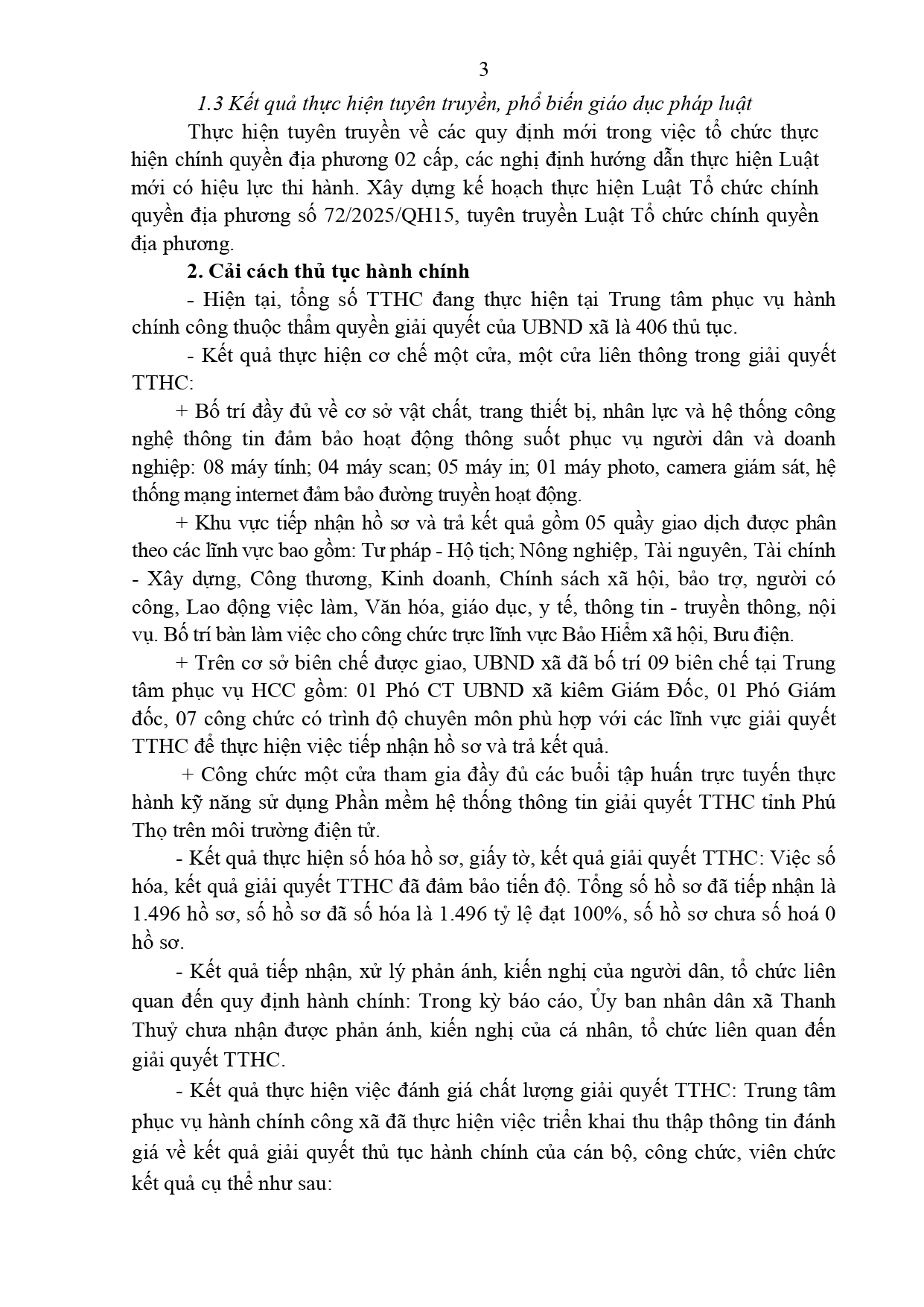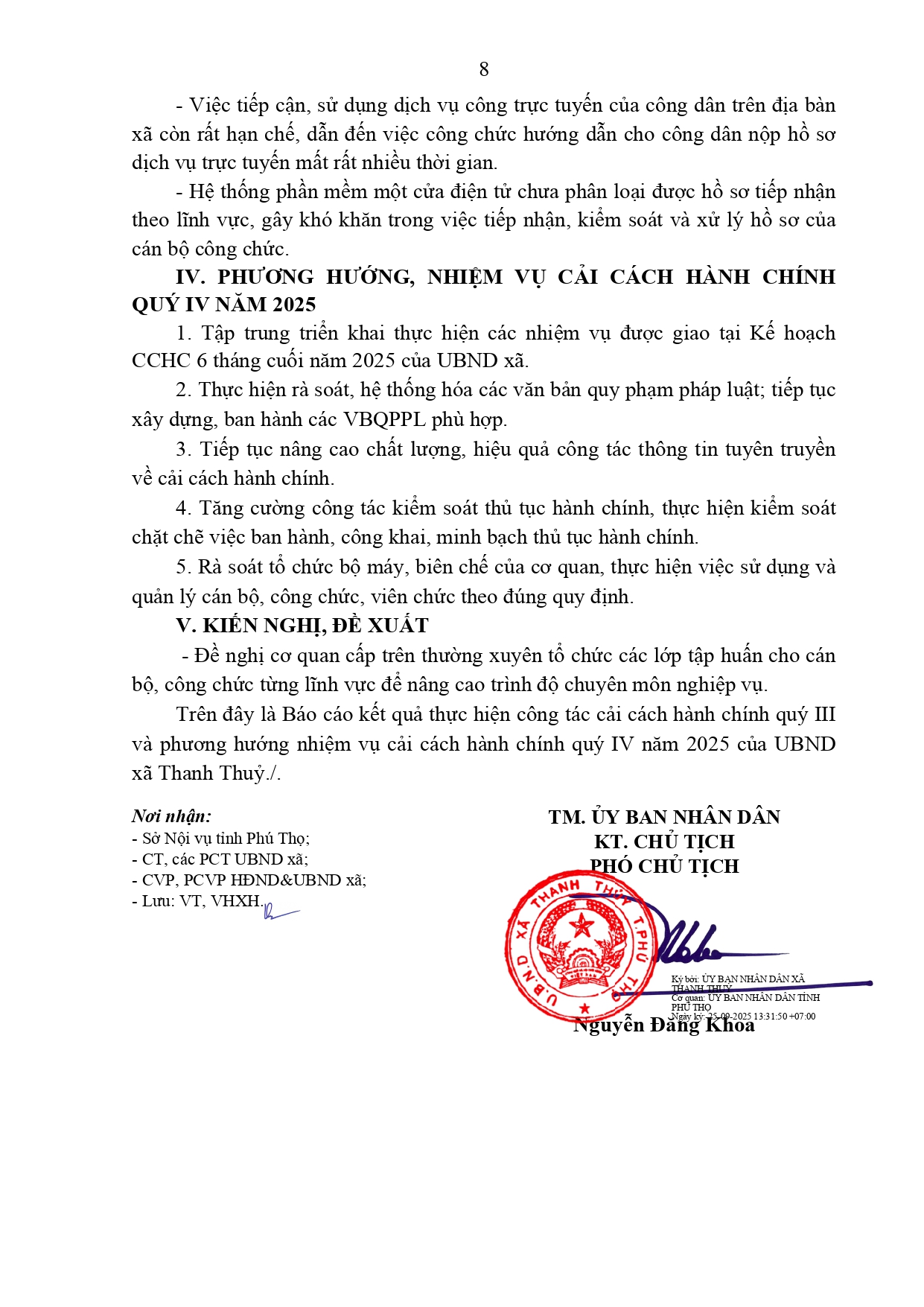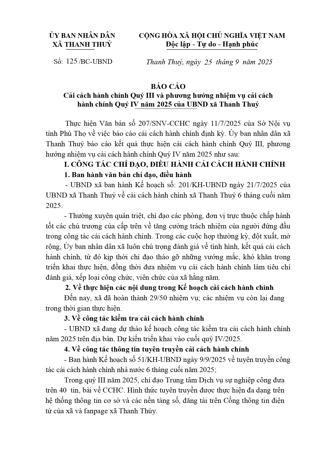Thanh Thuỷ báo cáo kết quả thực hiện cải cách hành chính Quý III, phương hướng nhiệm vụ cải cách hành chính Quý IV năm 2025 như sau: