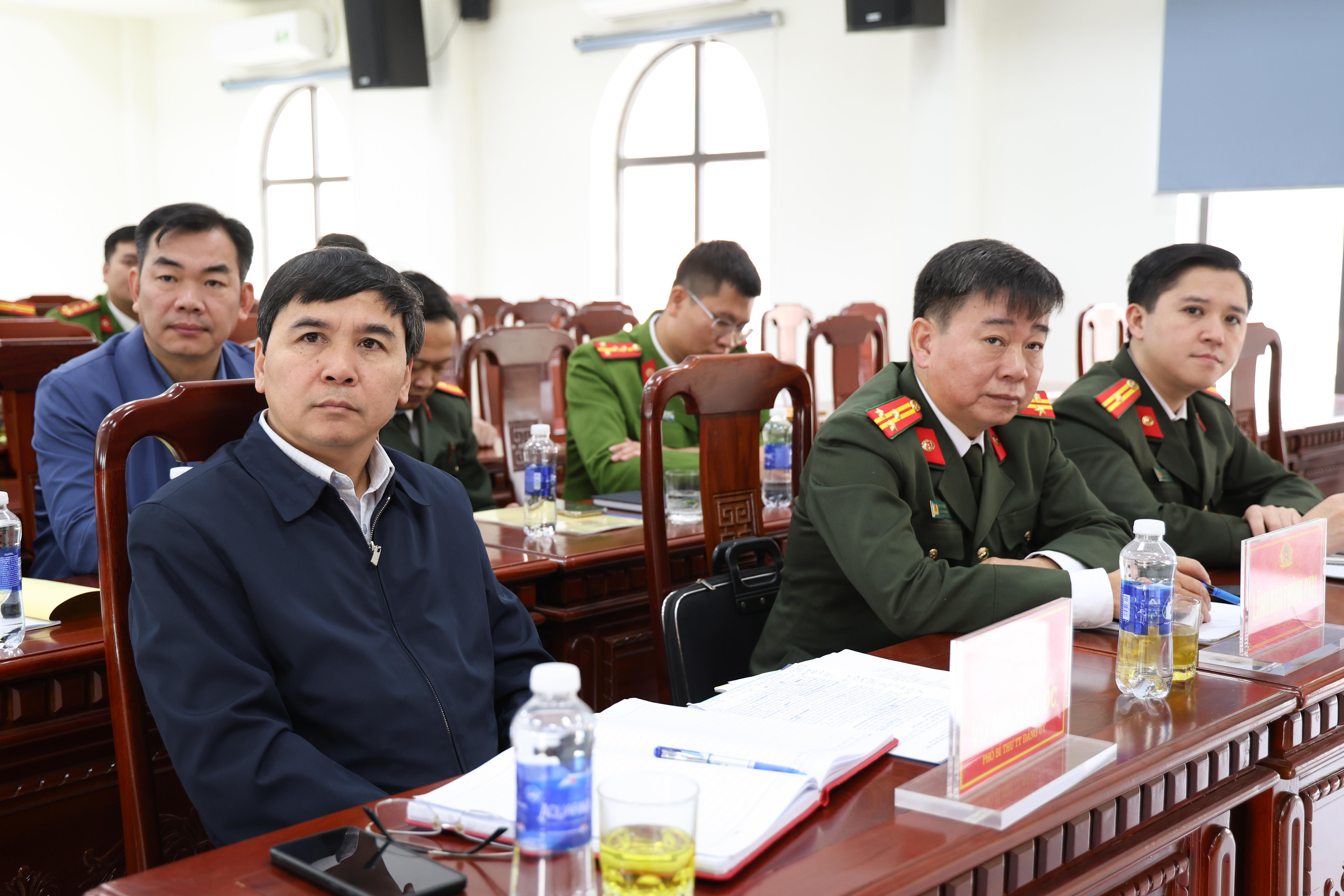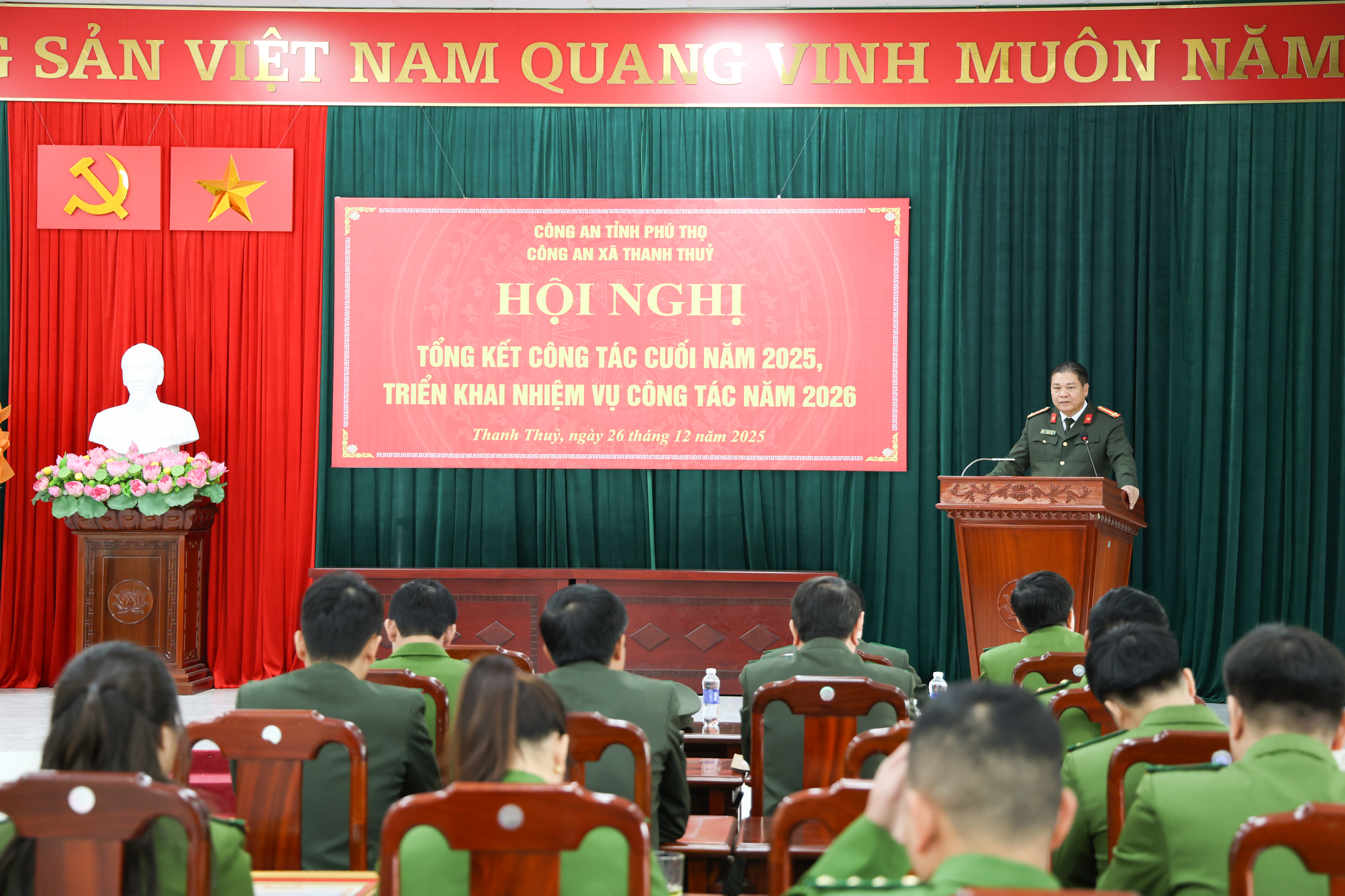 Phát biểu chỉ đạo tại Hội nghị, lãnh đạo Công an tỉnh và đồng chí Phó bí thư Thường trực Đảng uỷ Vũ Minh Quốc ghi nhận, đánh giá cao những nỗ lực, đóng góp tích cực của toàn lực lượng Công an xã trong thực hiện nhiệm vụ đảm bảo an ninh trật tự trên địa bàn. Thời gian tới, các đồng chí đề nghị Chi ủy, Chỉ huy Công an xã tiếp tục phát huy những kết quả đã đạt được, khắc phục những tồn tại, hạn chế đã chỉ ra; Tập trung thực hiện hiệu quả các chỉ đạo của đồng chí Giám đốc Công an tỉnh tại Hội nghị Tổng kết công tác Công an năm 2025, triển khai công tác Công an năm 2026. Tập trung chỉ đạo quyết liệt, thực hiện có hiệu quả đợt cao điểm tấn công trấn áp tội phạm, bảo đảm an ninh, trật tự, bảo vệ tuyệt đối an ninh, an toàn Đại hội đại biểu toàn quốc lần thứ XIV của Đảng, bầu cử đại biểu Quốc hội khoá XVI, Hội đồng nhân dân các cấp nhiệm kỳ 2026 - 2031, Tết Nguyên đán Bính Ngọ 2026, các sự kiện lớn của đất nước và các lễ hội đầu năm. Nâng cao chất lượng công tác tham mưu với cấp ủy chính quyền địa phương trong triển khai thực hiện nhiệm vụ đảm bảo an ninh trật tự ngay tại địa bàn cơ sở, đặc biệt trong công tác giải phóng mặt bằng các dự án trọng điểm trên địa bàn; Tiếp tục rà soát, điều chỉnh, bổ sung các đề án, chương trình, kế hoạch phòng, chống tội phạm phù hợp với mô hình tổ chức và bối cảnh tình hình mới, giảm tội phạm về trật tự xã hội, triển khai hiệu quả việc xây dựng xã sạch về ma túy. Duy trì thực hiện nghiêm túc các nội dung của đề án số 06 của Chính phủ; tăng cường công tác quản lý cư trú, quản lý vũ khí, vật liệu nổ; Làm tốt công tác dân vận, xây dựng thế trận an ninh nhân dân, thế trận quốc phòng toàn dân, phát huy hiệu quả hoạt động của lực lượng tham gia đảm bảo an ninh trật tự ở cơ sở. Tiếp tục thực hiện đồng bộ các giải pháp nâng cao chất lượng công tác xây dựng Đảng, xây dựng lực lượng Công an thật sự trong sạch, vững mạnh, chính quy, tinh nhuệ, hiện đại đáp ứng yêu cầu, nhiệm vụ trong tình hình mới.