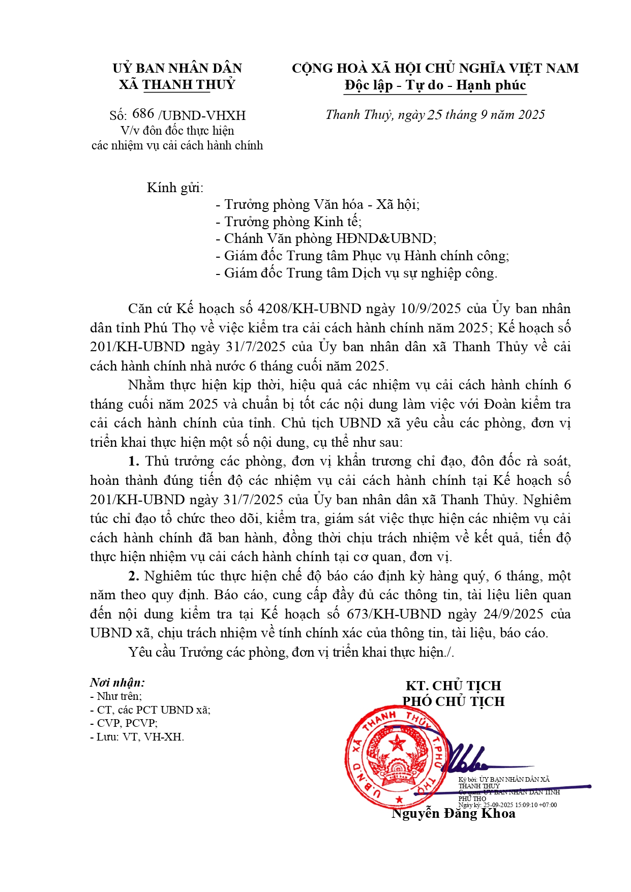 Nhằm thực hiện kịp thời, hiệu quả các nhiệm vụ cải cách hành chính 6 tháng cuối năm 2025 và chuẩn bị tốt các nội dung làm việc với Đoàn kiểm tra cải cách hành chính của tỉnh. Chủ tịch UBND xã y u c u các phòng, đơn vị triển khai thực hiện một số nội dung, cụ thể như sau: