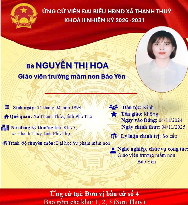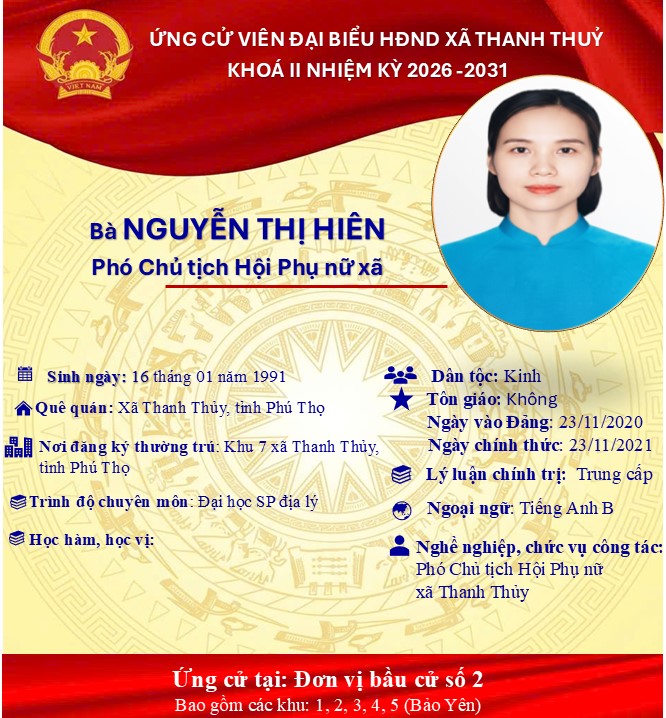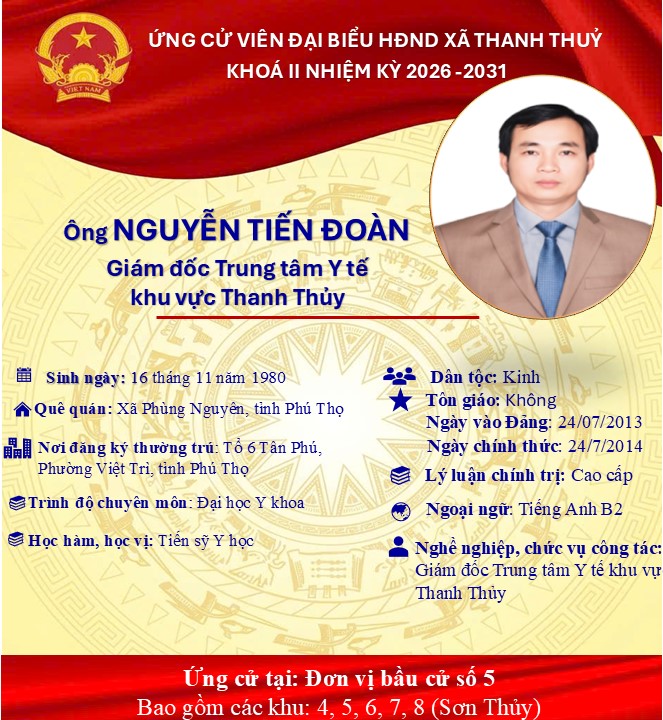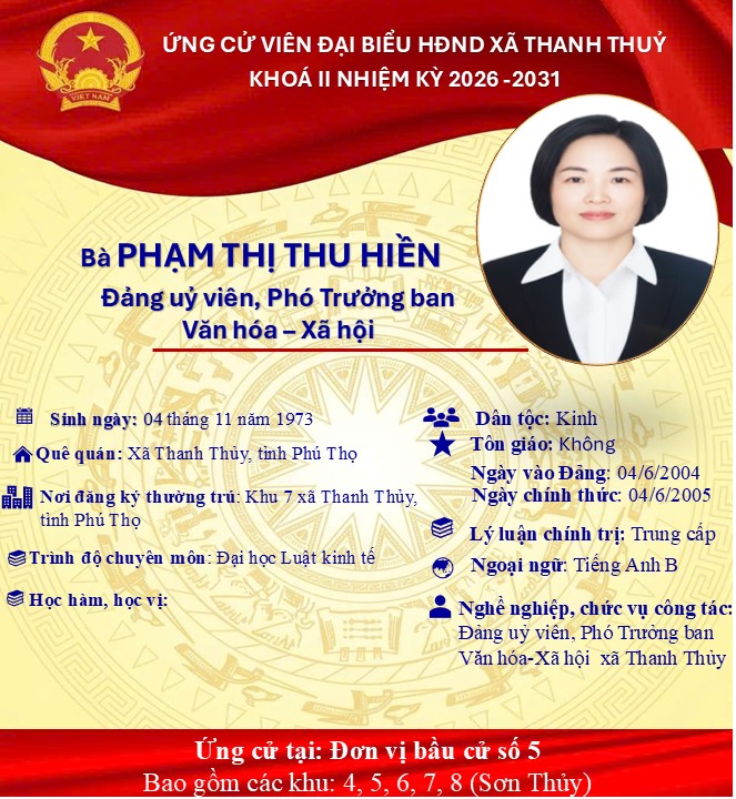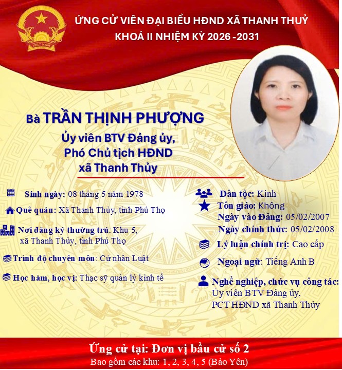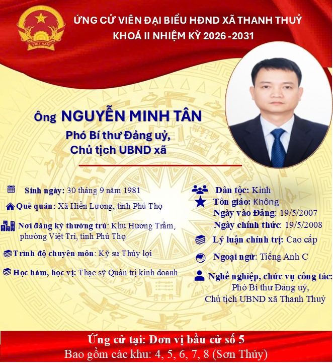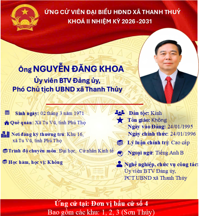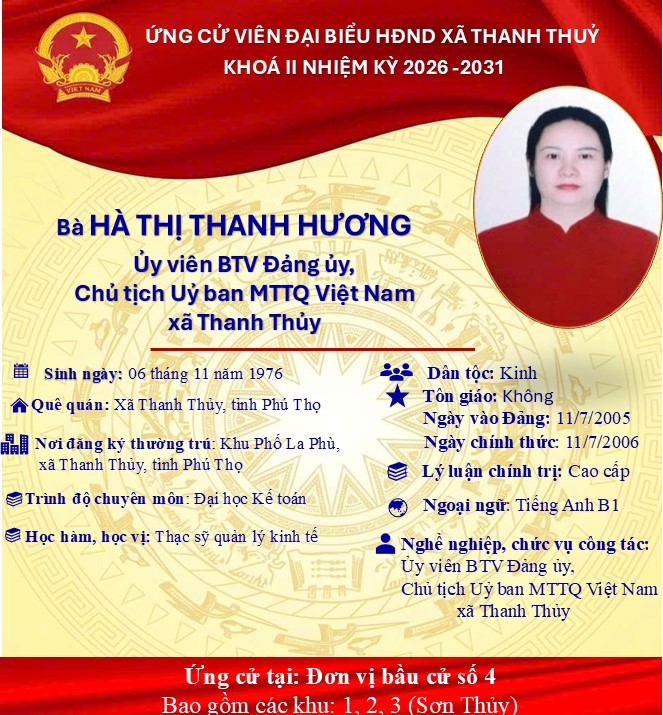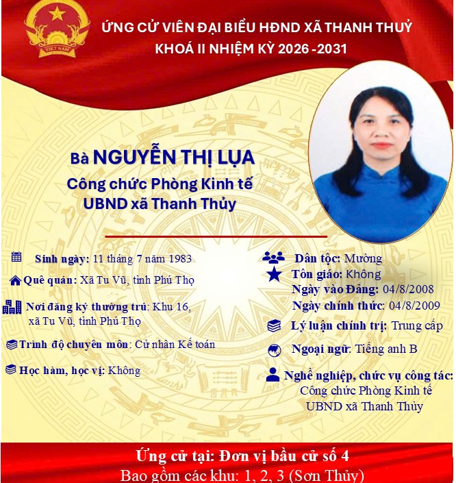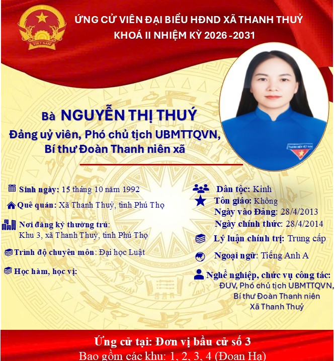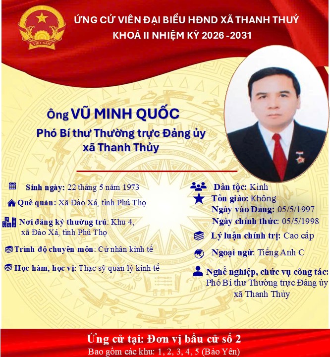 Thông tin tóm tắt lý lịch của 34 ứng cử viên Đại biểu HĐND xã Thanh Thuỷ khoá II nhiệm kỳ 2026 - 2031