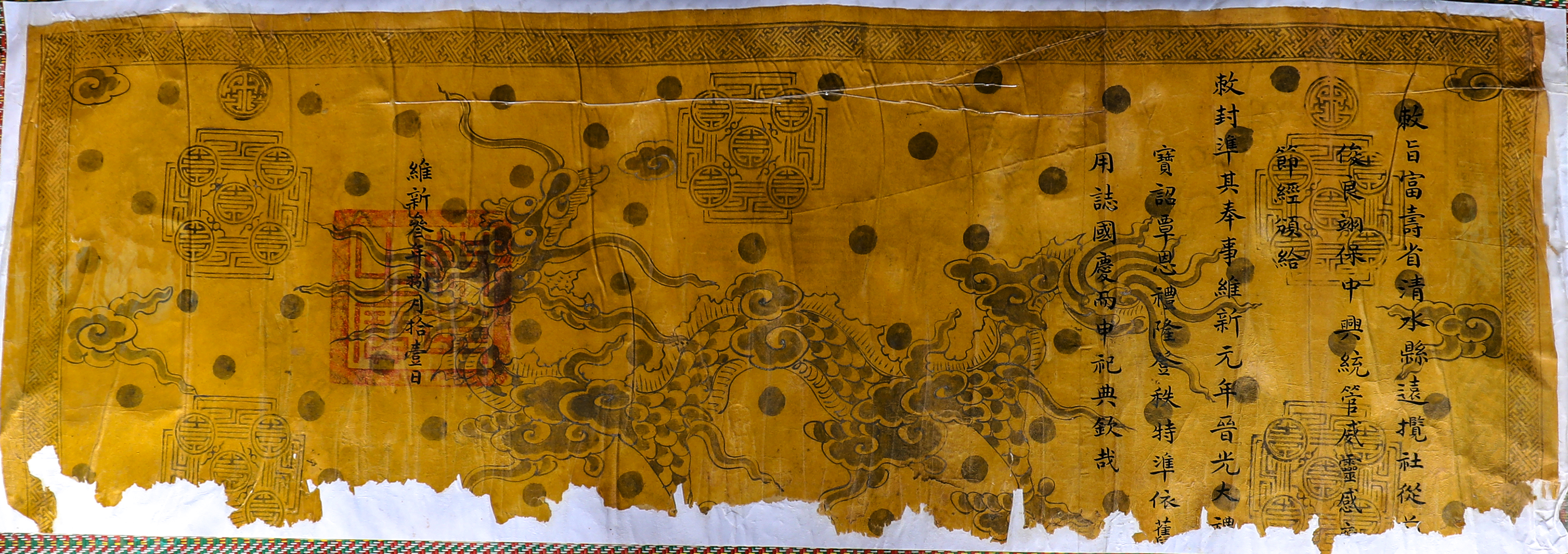 Sắc chỉ Phú Thọ tỉnh, Thanh Thuỷ huyện, Viễn Lãm xã tòng tiền phụng sự, Tuấn Lương Dực bảo trung hưng tổng quản uy linh cảm ứng chi thần. Tiết kinh ban cấp, Sắc phong chuẩn kỳ phụng sự. Duy Tân nguyên niên tấn quang đại lễ kinh, ban bảo chiếu đàm ân, lễ long đăng trật. Đặc chuẩn y cựu phụng sự dụng chí quốc khánh nhi thân tự điển.