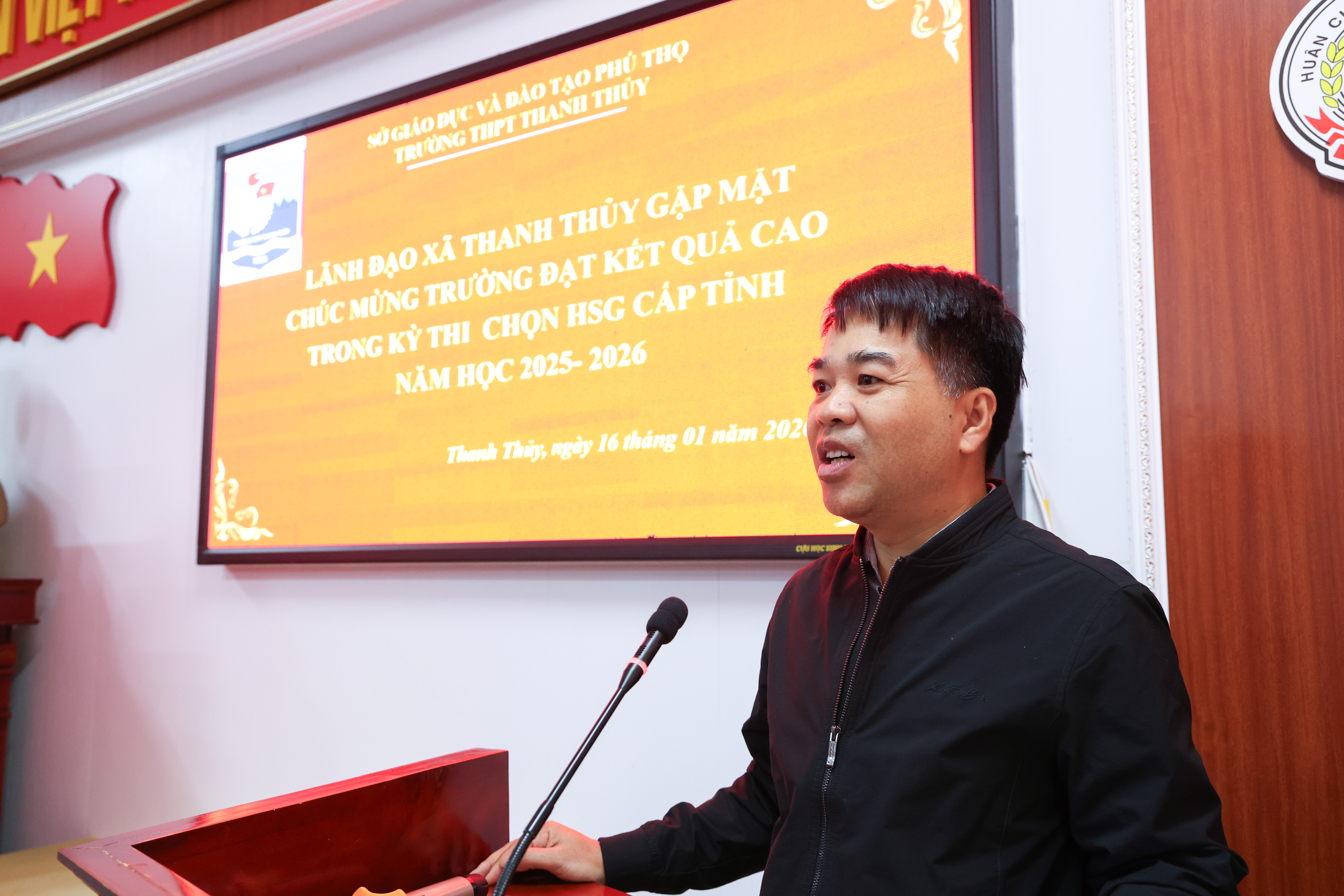 Phát biểu chúc mừng, đồng chí Chủ tịch UBND xã Nguyễn Minh Tân nhấn mạnh, thành tích mà các em học sinh đạt được không chỉ là niềm tự hào của riêng nhà trường mà còn là niềm vui chung của cấp uỷ, chính quyền và Nhân dân địa phương, góp phần khẳng định chất lượng giáo dục mũi nhọn của xã Thanh Thuỷ trong những năm gần đây. Đây là minh chứng sinh động cho sự cố gắng bền bỉ của các em, sự tận tâm của các thầy cô giáo và sự quan tâm, đồng hành của gia đình, địa phương đối với sự nghiệp trồng người. Đồng chí mong muốn Trường THPT Thanh Thuỷ tiếp tục phát huy truyền thống dạy tốt - học tốt, không ngừng đổi mới phương pháp giảng dạy, bồi dưỡng học sinh giỏi, góp phần nâng cao chất lượng giáo dục toàn diện, đào tạo nhiều thế hệ học sinh có tri thức, đạo đức và bản lĩnh, đáp ứng yêu cầu phát triển của quê hương.