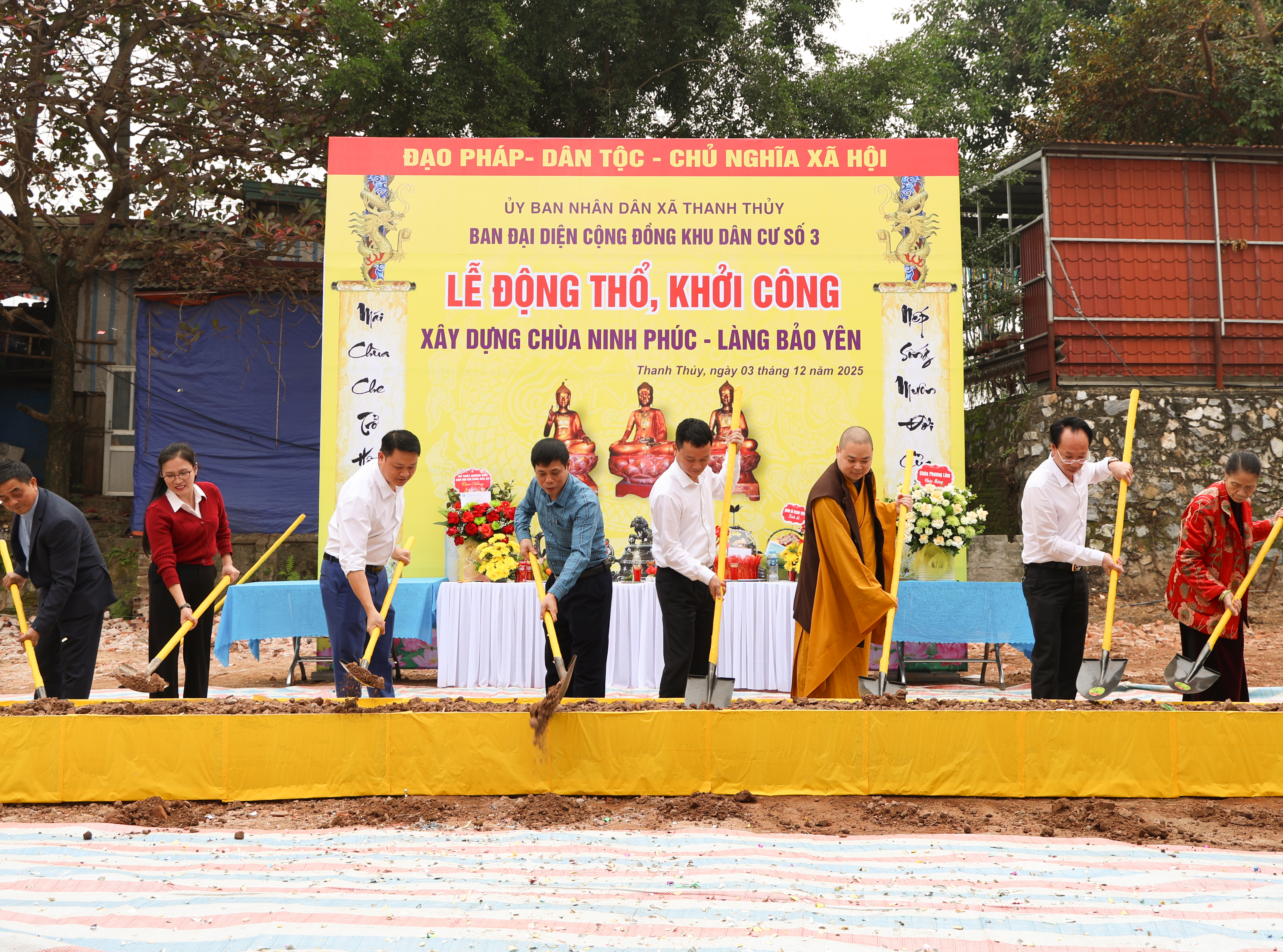 Dự lễ động thổ có đồng chí Nguyễn Minh Tân - Phó Bí thư Đảng uỷ, Chủ tịch UBND xã; đồng chí Nguyễn Anh Tuấn - Uỷ viên Ban Thường vụ Đảng uỷ, Phó Chủ tịch UBND xã; lãnh đạo Phòng Văn hoá - xã hội; Văn phòng HĐND - UBND; Trung tâm Phục vụ Hành chính công xã; đại diện Hội phật giáo xã Thanh Thuỷ cùng đông đảo nhân dân địa phương.