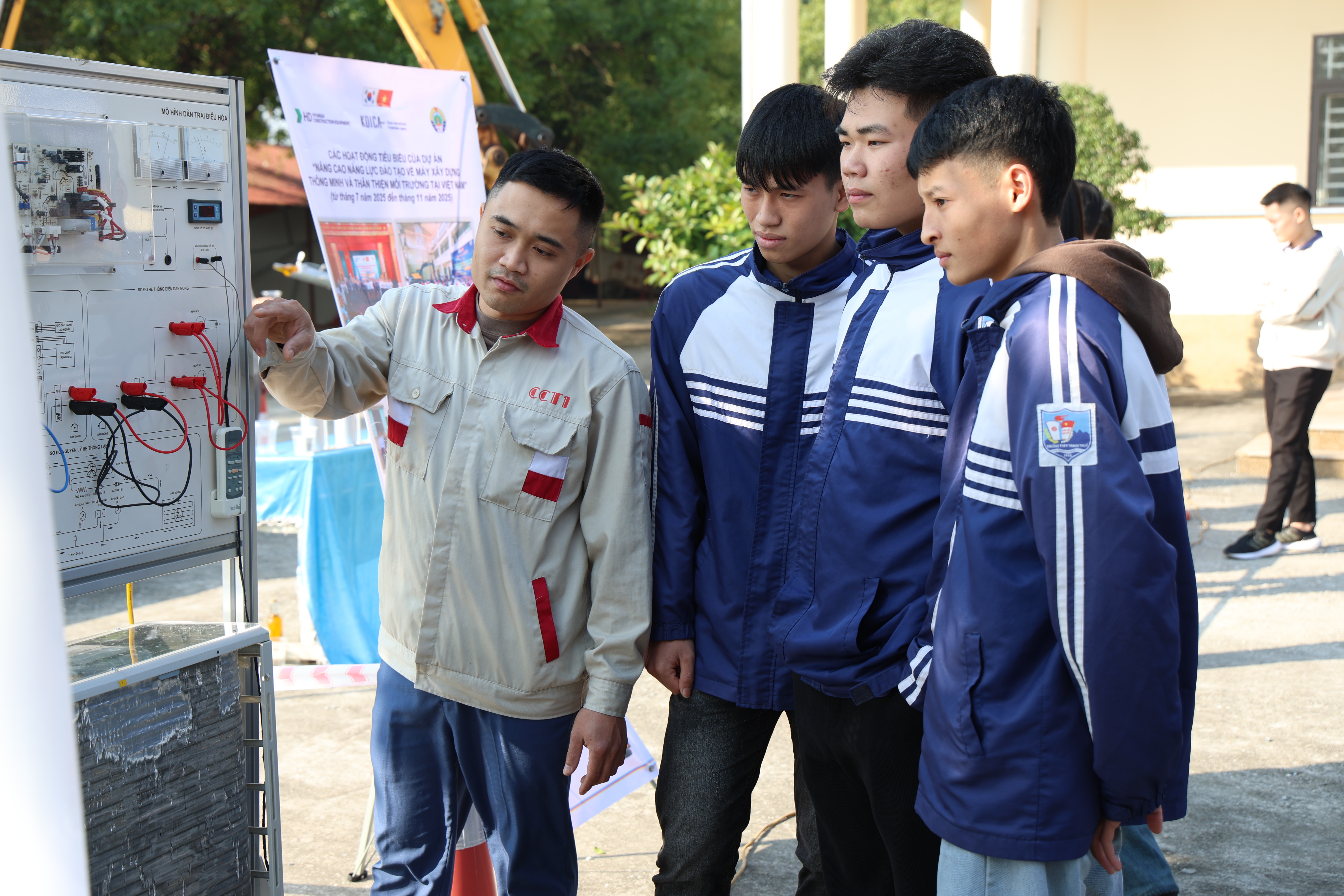 Các đại biểu cùng các em học sinh tham quan, nghe các doanh nghiệp giới thiệu, định hướng nghề nghiệp