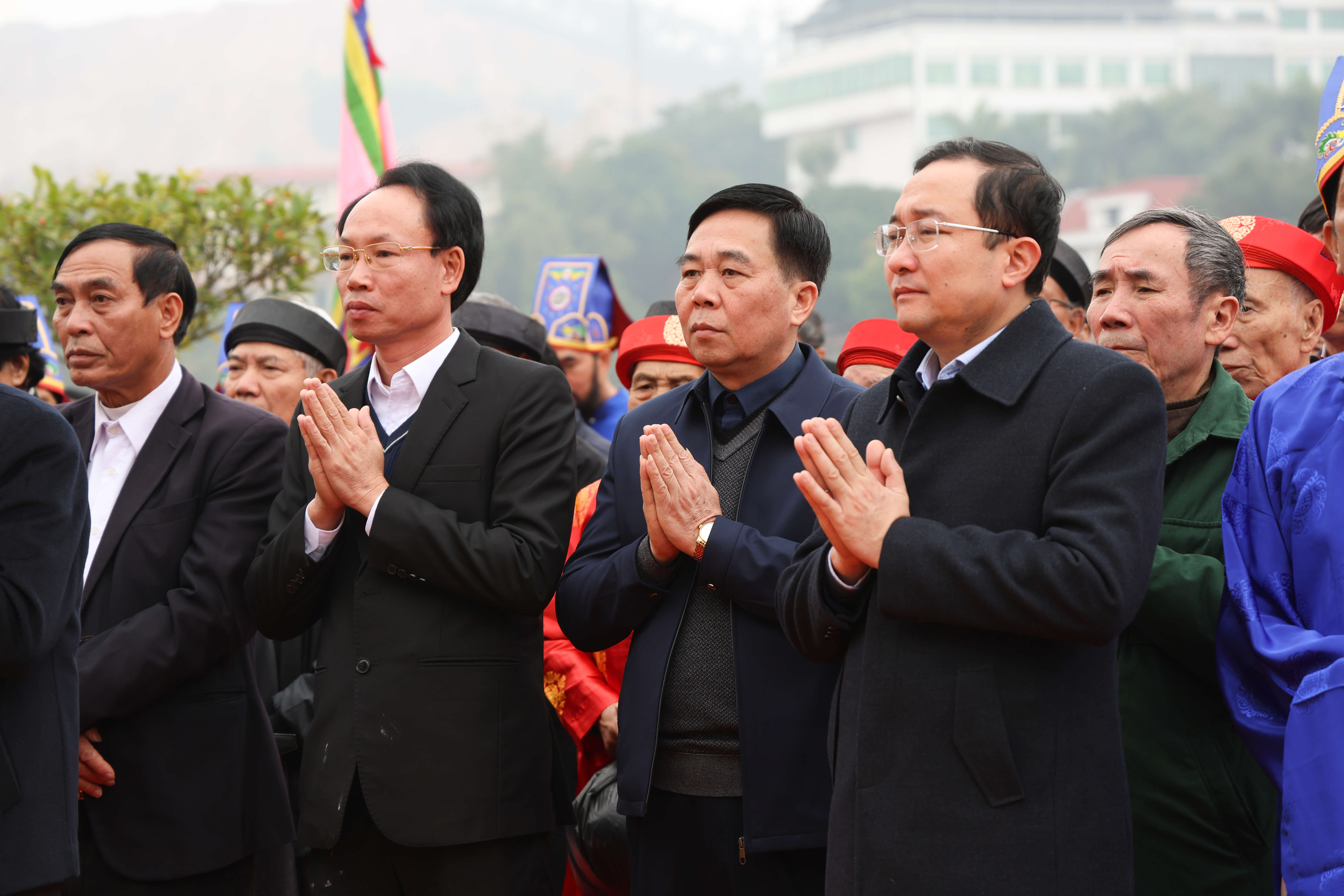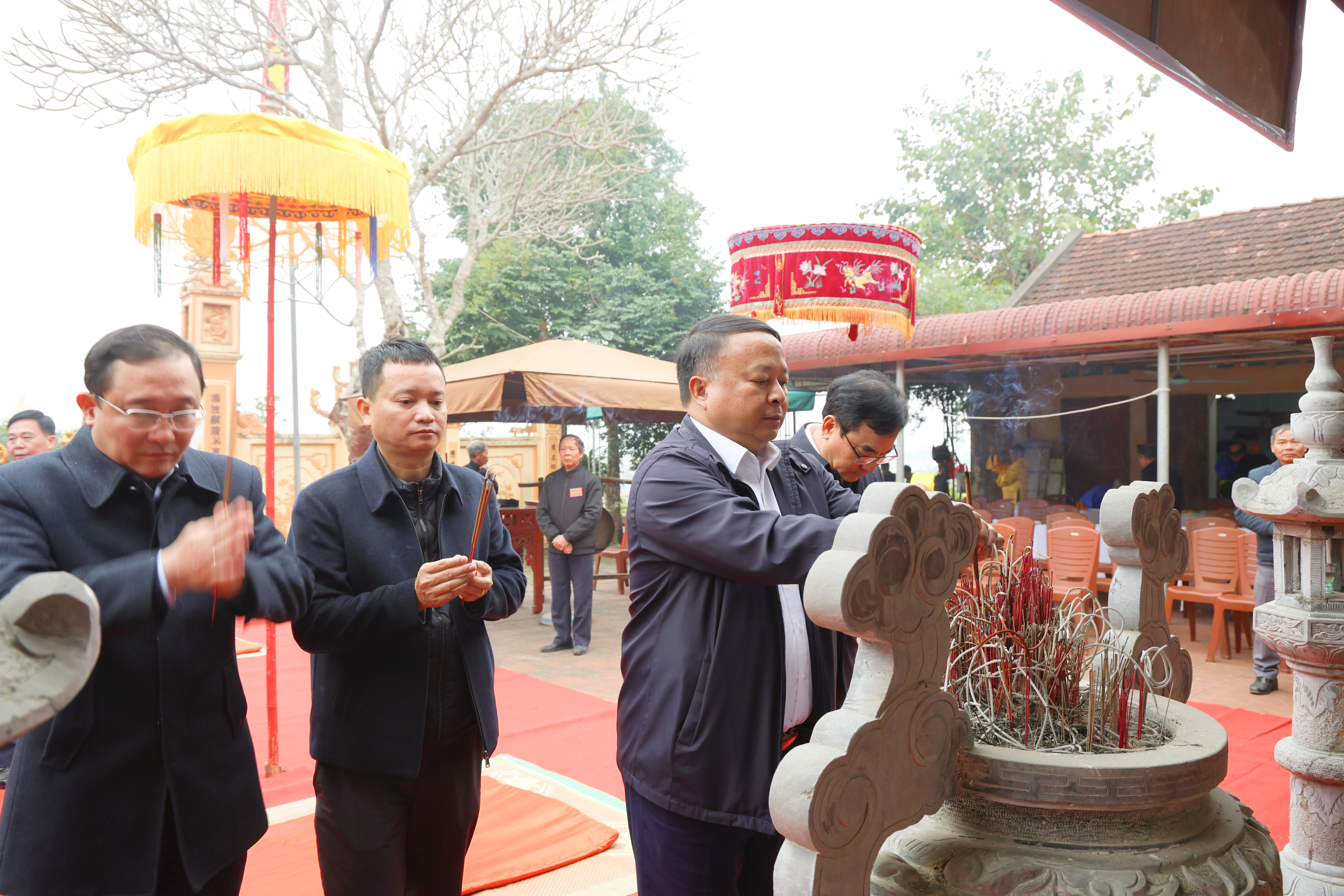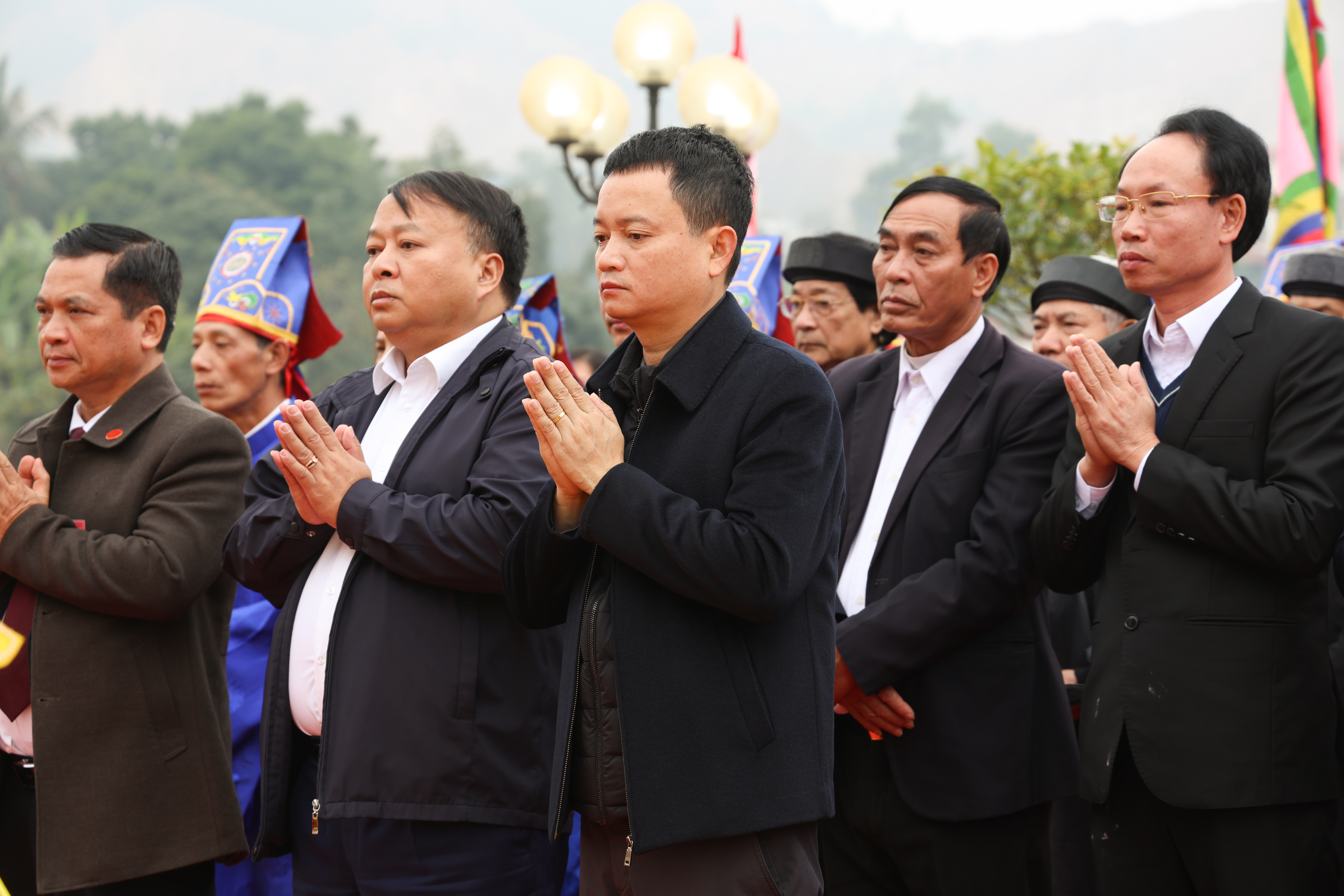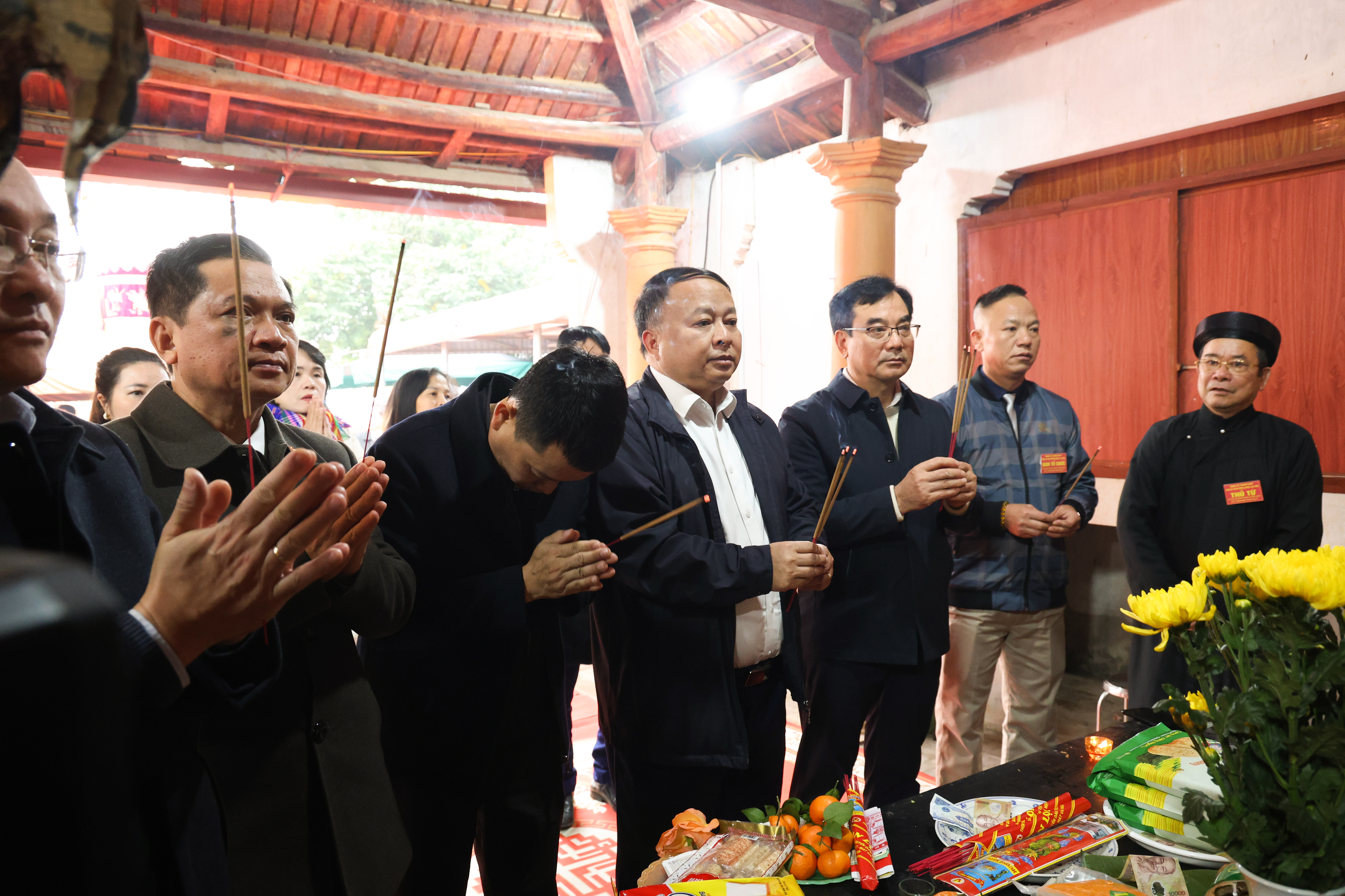 Đồng chí Chủ tịch UBND tỉnh Tuyên Quang Phan Huy Ngọc và đồng chí Chủ tịch UBND xã Nguyễn Minh Tân cùng các đại biểu dự tại Lăng Đức Thánh mẫu