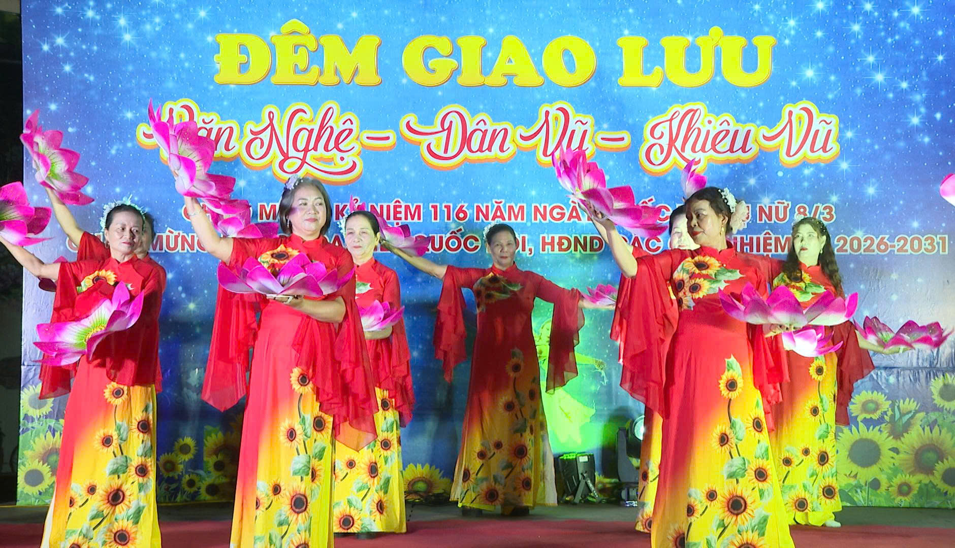 Đêm giao lưu có sự tham gia của 18 tiết mục văn nghệ do hội viên phụ nữ đến từ các khu dân cư trên địa bàn xã biểu diễn. Chương trình diễn ra trong không khí vui tươi, phấn khởi với các tiết mục ca ngợi Đảng quang vinh, Bác Hồ kính yêu, tình yêu quê hương, đất nước, truyền thống cách mạng của dân tộc; thể hiện niềm tin của Nhân dân đối với sự lãnh đạo của Đảng và kỳ vọng vào thành công của cuộc bầu Đại biểu Quốc hội khóa XVI và Đại biểu HĐND các cấp. Xen kẽ là các tiết mục dân vũ sôi động, tạo không khí rộn ràng, thu hút sự cổ vũ nhiệt tình của khán giả.