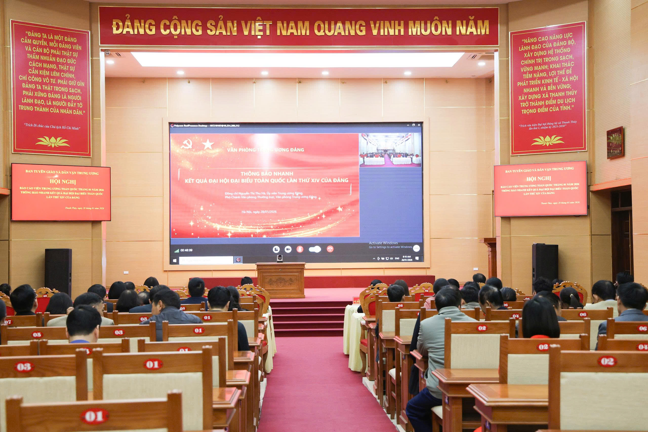 Hội nghị đã nghe thông báo nhanh kết quả Đại hội đại biểu toàn quốc lần thứ XIV của Đảng. Theo đó, sau 5 ngày (từ ngày 19 đến 23/1) làm việc nghiêm túc, dân chủ, trách nhiệm, phát huy trí tuệ tập thể, Đại hội đã hoàn thành toàn bộ nội dung chương trình đề ra và thành công tốt đẹp. Tại Đại hội, Ban Chấp hành Trung ương Đảng khóa XIII trình Đại hội các văn kiện gồm: Báo cáo chính trị; Báo cáo tổng kết một số vấn đề lý luận và thực tiễn về công cuộc đổi mới theo định hướng xã hội chủ nghĩa trong 40 năm qua; Báo cáo tổng kết 15 năm thi hành Điều lệ Đảng (2011-2025) và định hướng sửa đổi, bổ sung Điều lệ Đảng; Báo cáo kiểm điểm sự lãnh đạo, chỉ đạo của Ban Chấp hành Trung ương Đảng khóa XIII. Với tinh thần trách nhiệm cao, các đại biểu đã nghiên cứu kỹ các văn kiện và thảo luận sôi nổi với 815 lượt ý kiến phát biểu tại đoàn và hội trường.