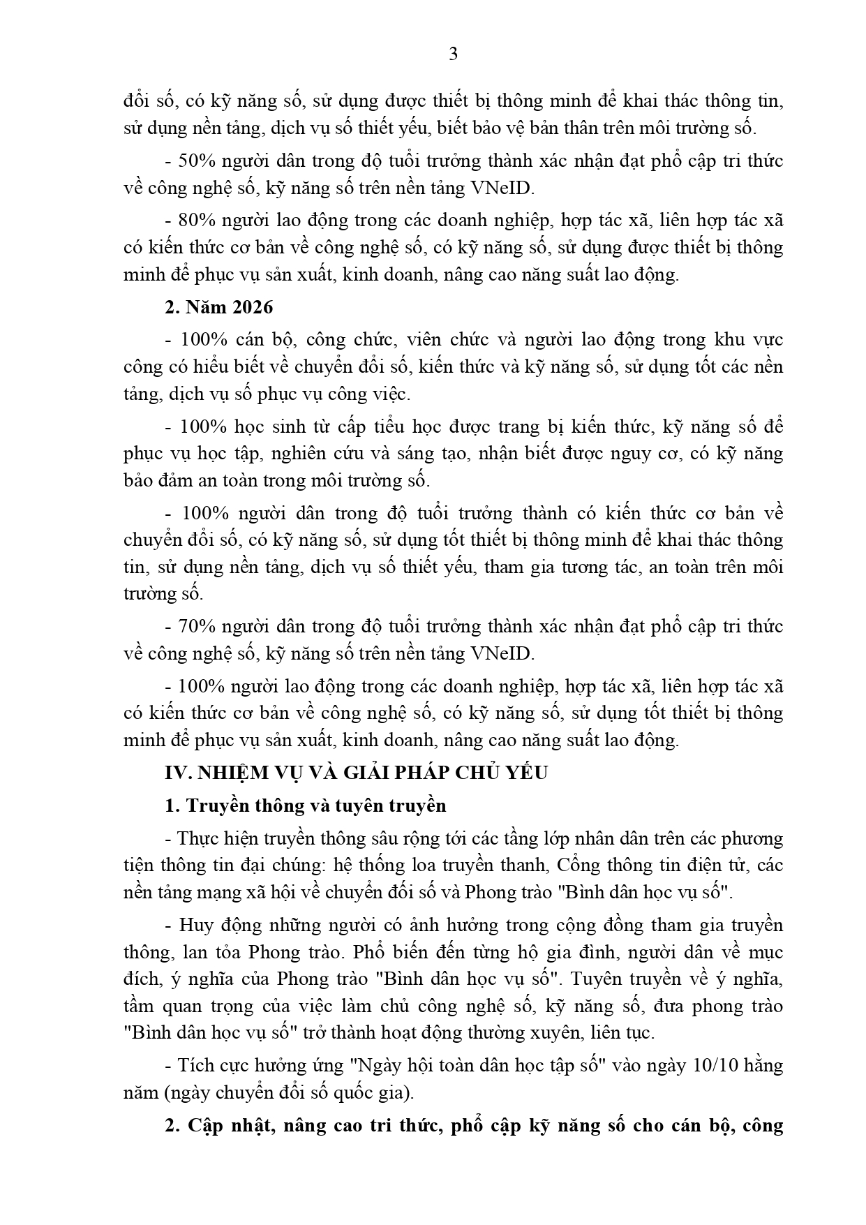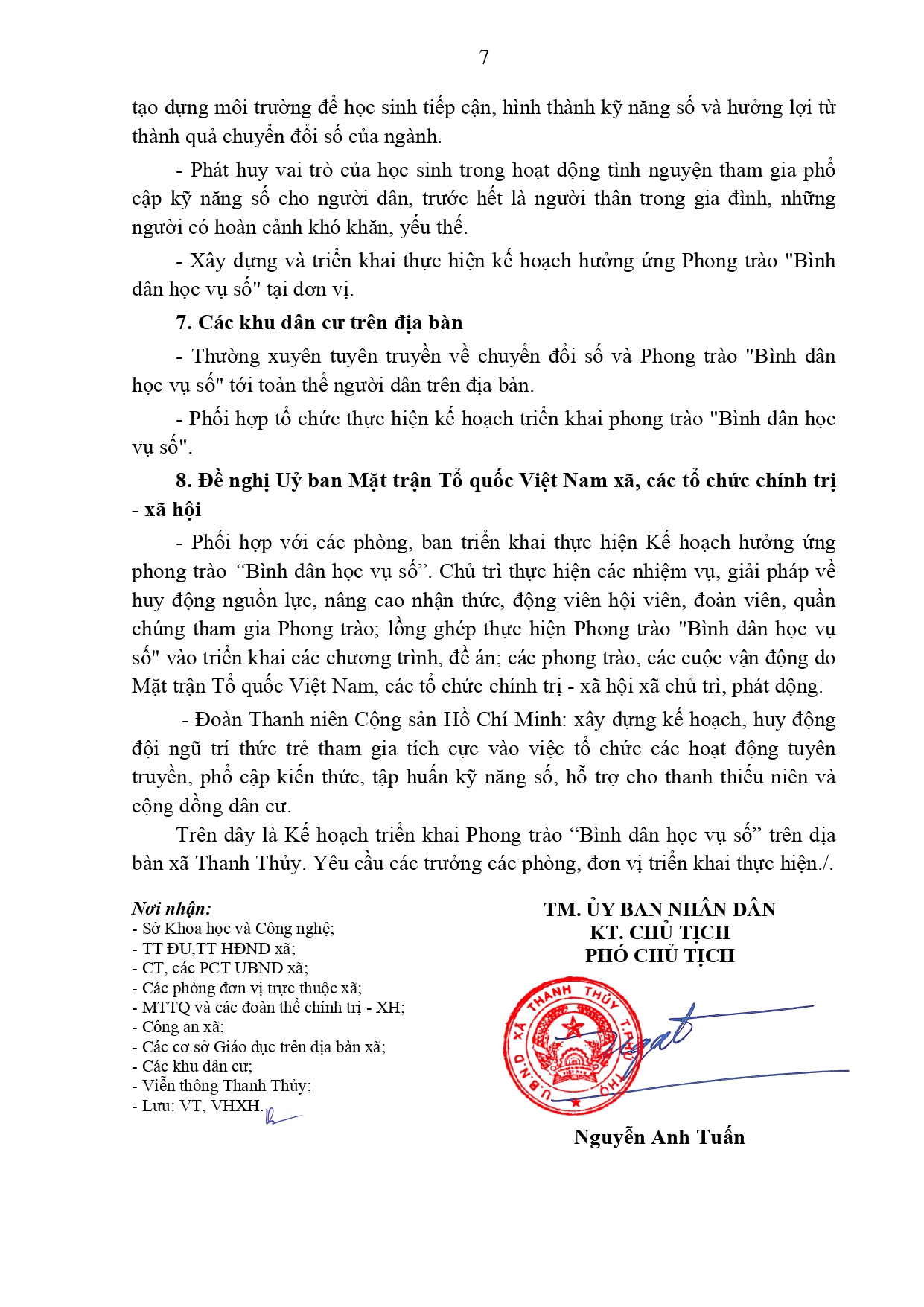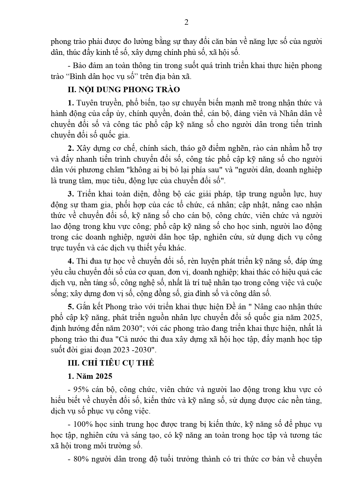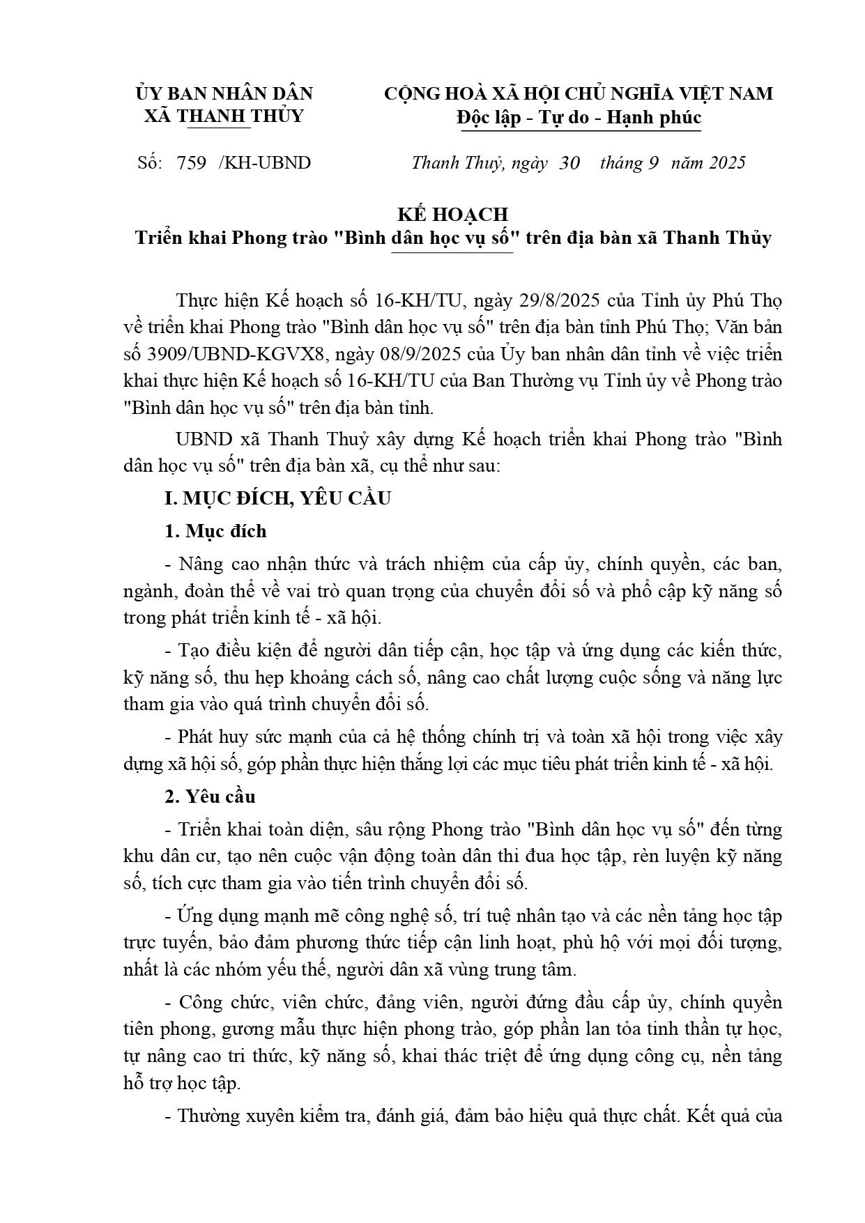 Thực hiện Kế hoạch số 16-KH/TU, ngày 29/8/2025 của Tỉnh ủy Phú Thọ về triển khai Phong trào "Bình dân học vụ số" trên địa bàn tỉnh Phú Thọ; Văn bản số 3909/UBND-KGVX8, ngày 08/9/2025 của Ủy ban nhân dân tỉnh về việc triển khai thực hiện Kế hoạch số 16-KH/TU của Ban Thường vụ Tỉnh ủy về Phong trào "Bình dân học vụ số" trên địa bàn tỉnh. UBND xã Thanh Thuỷ xây dựng Kế hoạch triển khai Phong trào "Bình dân học vụ số" trên địa bàn xã, cụ thể như sau: