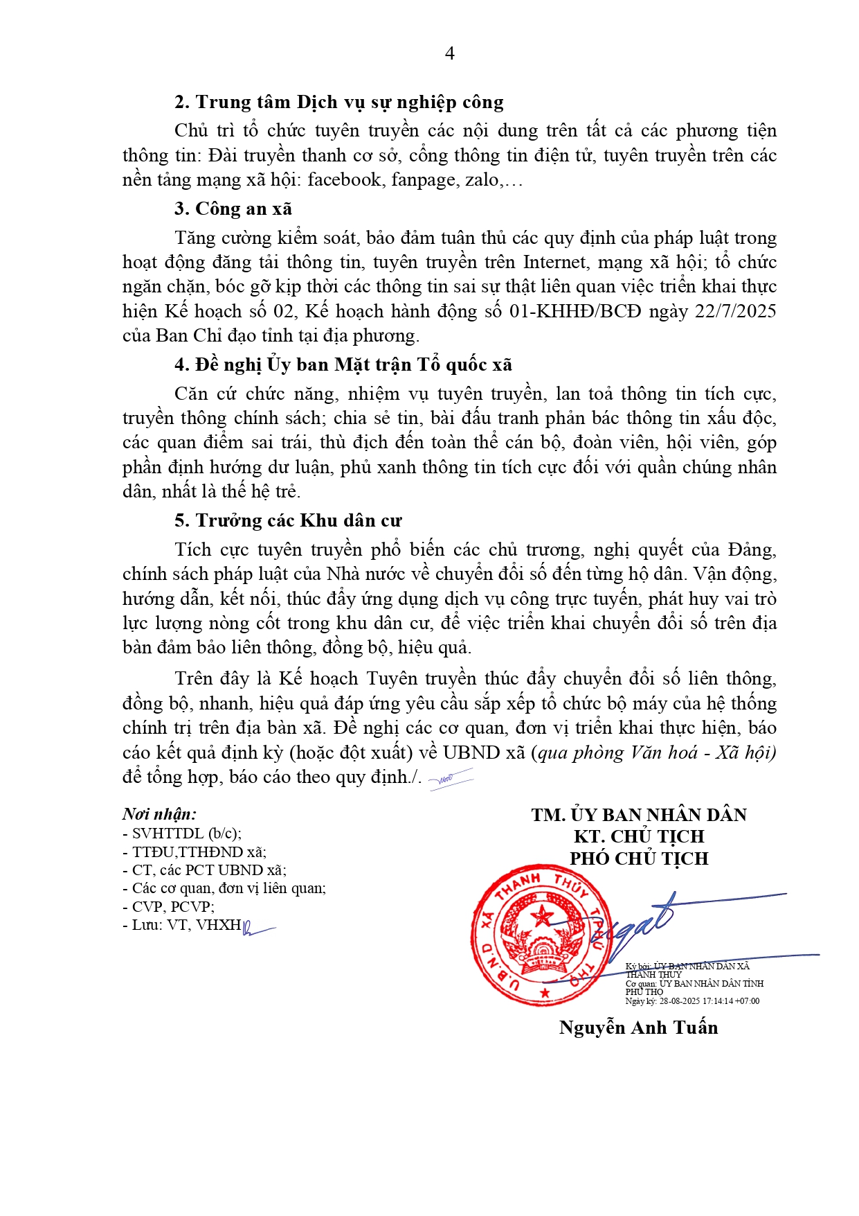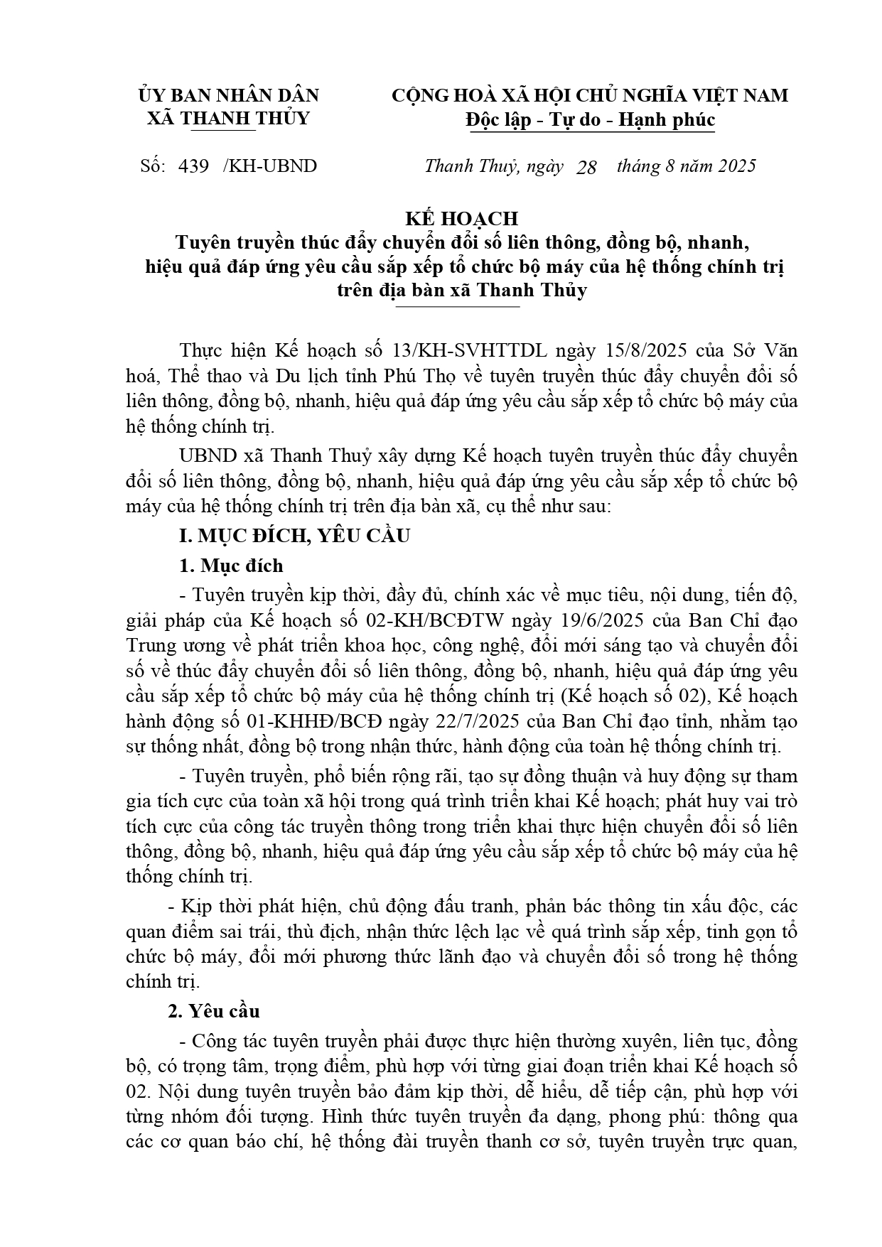 liên thông, đồng bộ, nhanh, hiệu quả đáp ứng yêu cầu sắp xếp tổ chức bộ máy của hệ thống chính trị. UBND xã Thanh Thuỷ xây dựng Kế hoạch tuyên truyền thúc đẩy chuyển đổi số liên thông, đồng bộ, nhanh, hiệu quả đáp ứng yêu cầu sắp xếp tổ chức bộ máy của hệ thống chính trị trên địa bàn xã, cụ thể như sau: