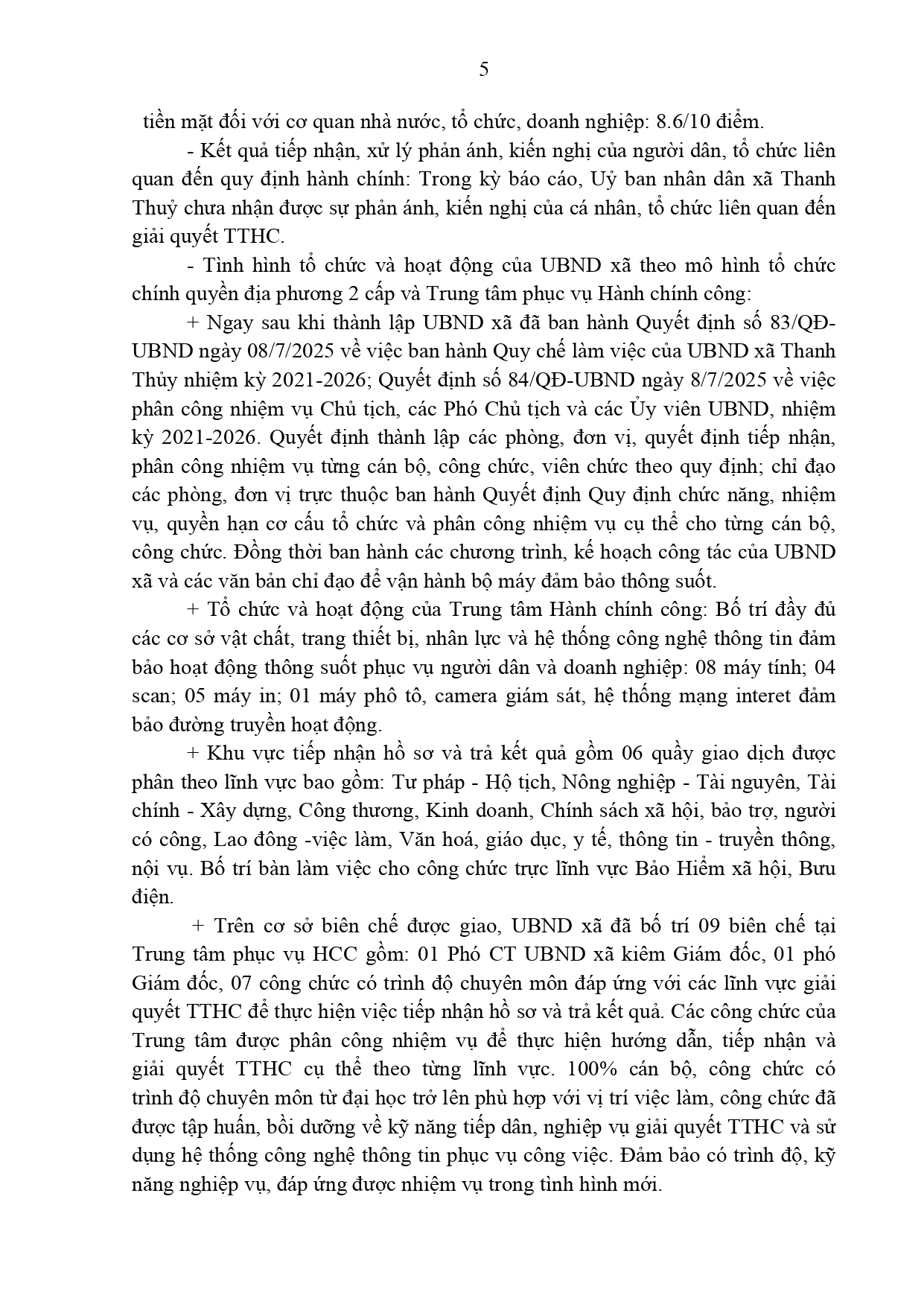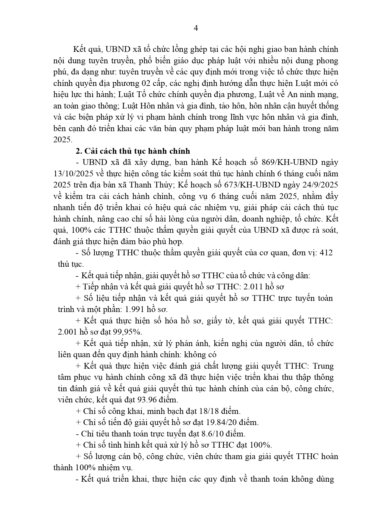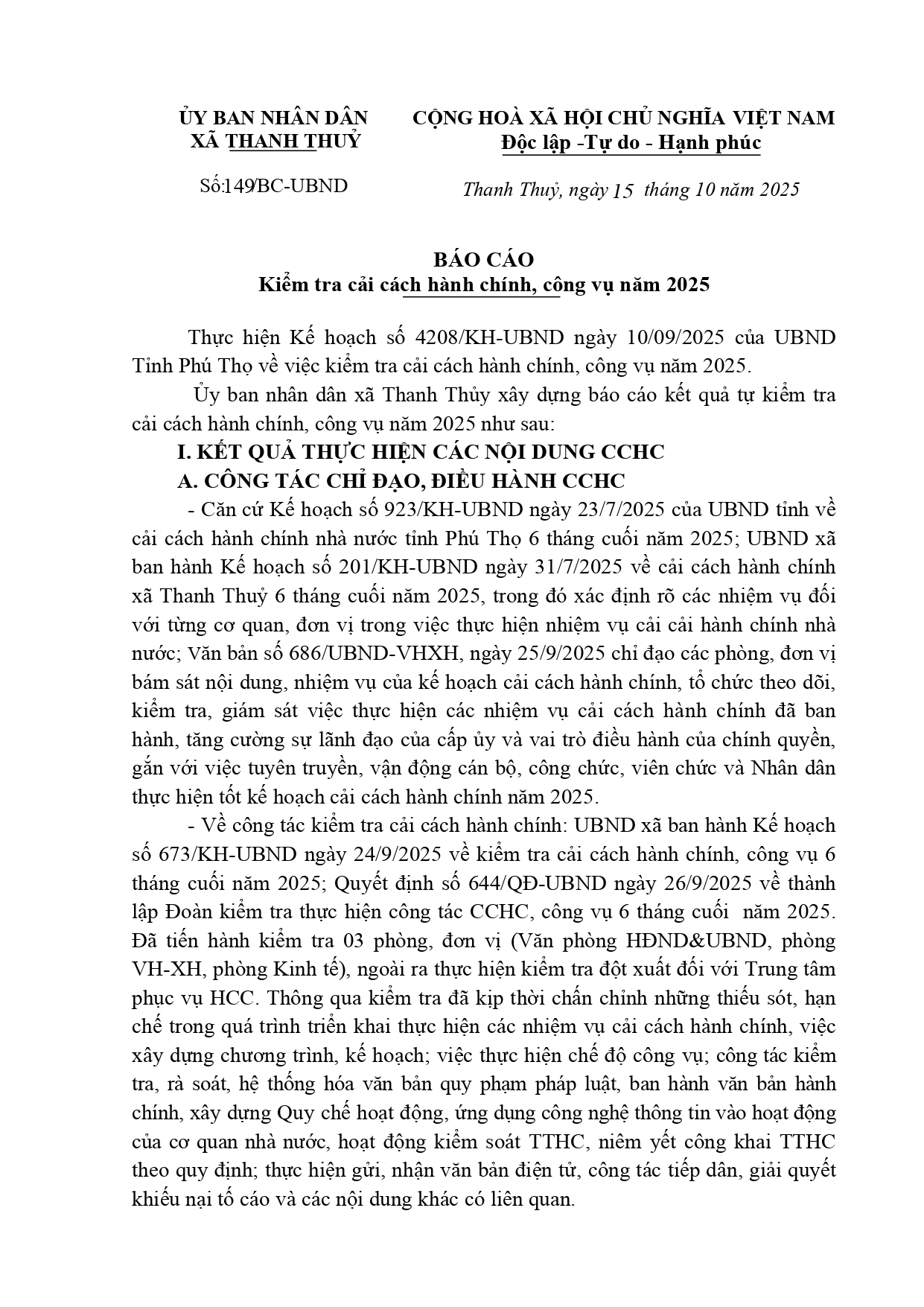 Thực hiện Kế hoạch số 4208/KH-UBND ngày 10/09/2025 của UBND Tỉnh Phú Thọ về việc kiểm tra cải cách hành chính, công vụ năm 2025. Ủy ban nhân dân xã Thanh Thủy xây dựng báo cáo kết quả tự kiểm tra cải cách hành chính, công vụ năm 2025 như sau: