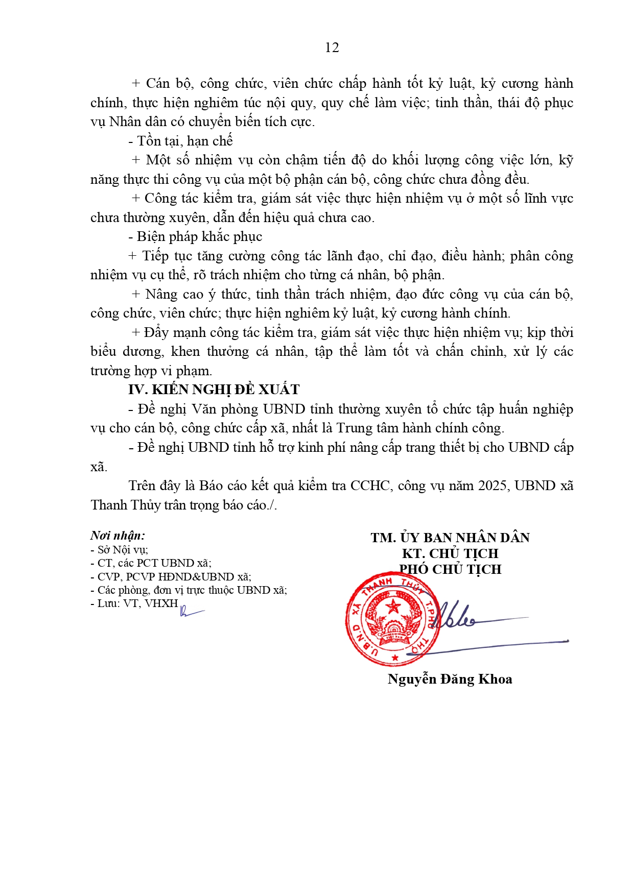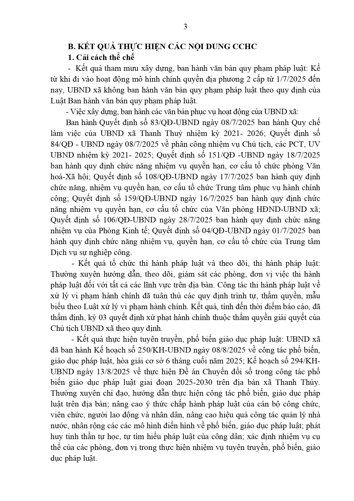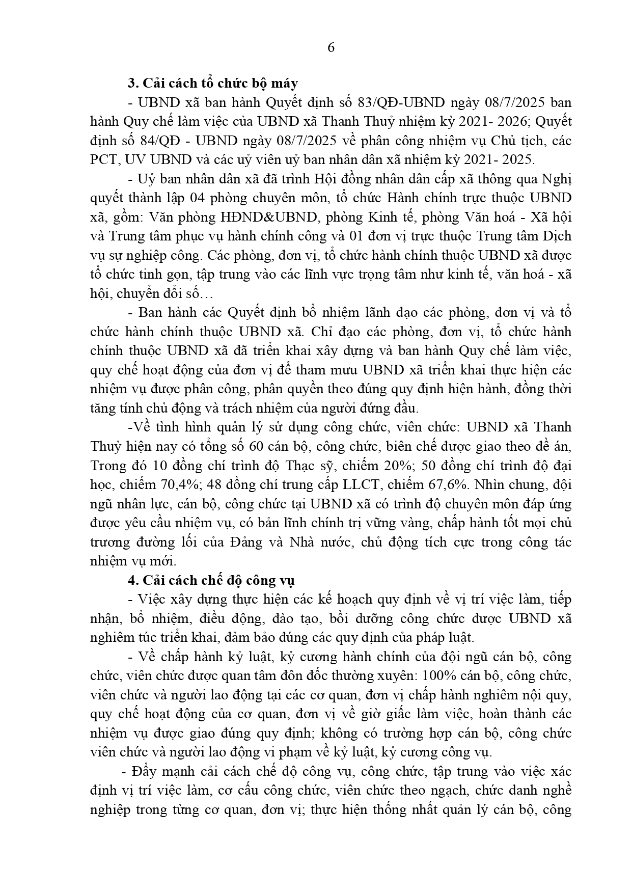 Thực hiện Kế hoạch số 4208/KH-UBND ngày 10/09/2025 của UBND Tỉnh Phú Thọ về việc kiểm tra cải cách hành chính, công vụ năm 2025. Ủy ban nhân dân xã Thanh Thủy xây dựng báo cáo kết quả tự kiểm tra cải cách hành chính, công vụ năm 2025 như sau: