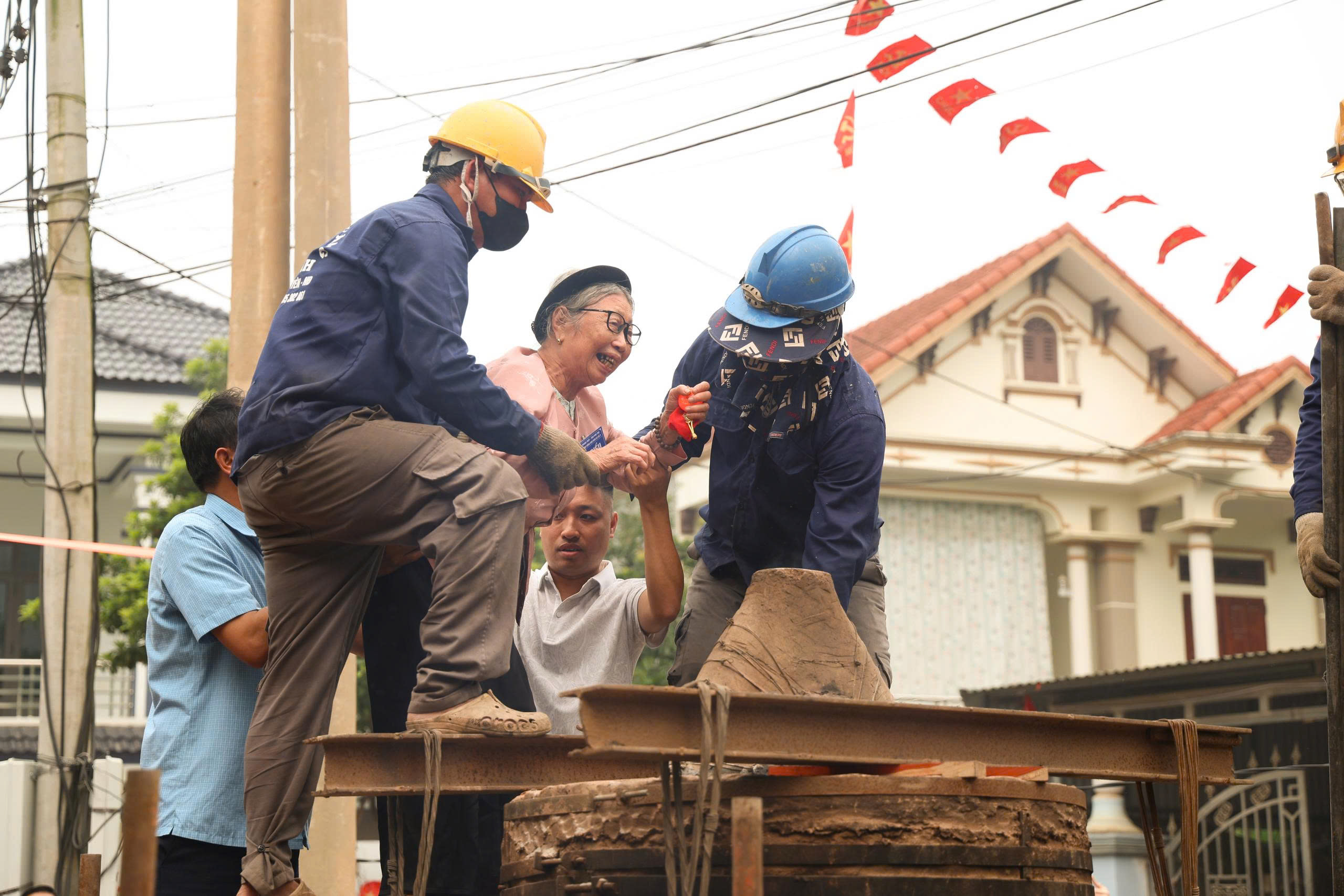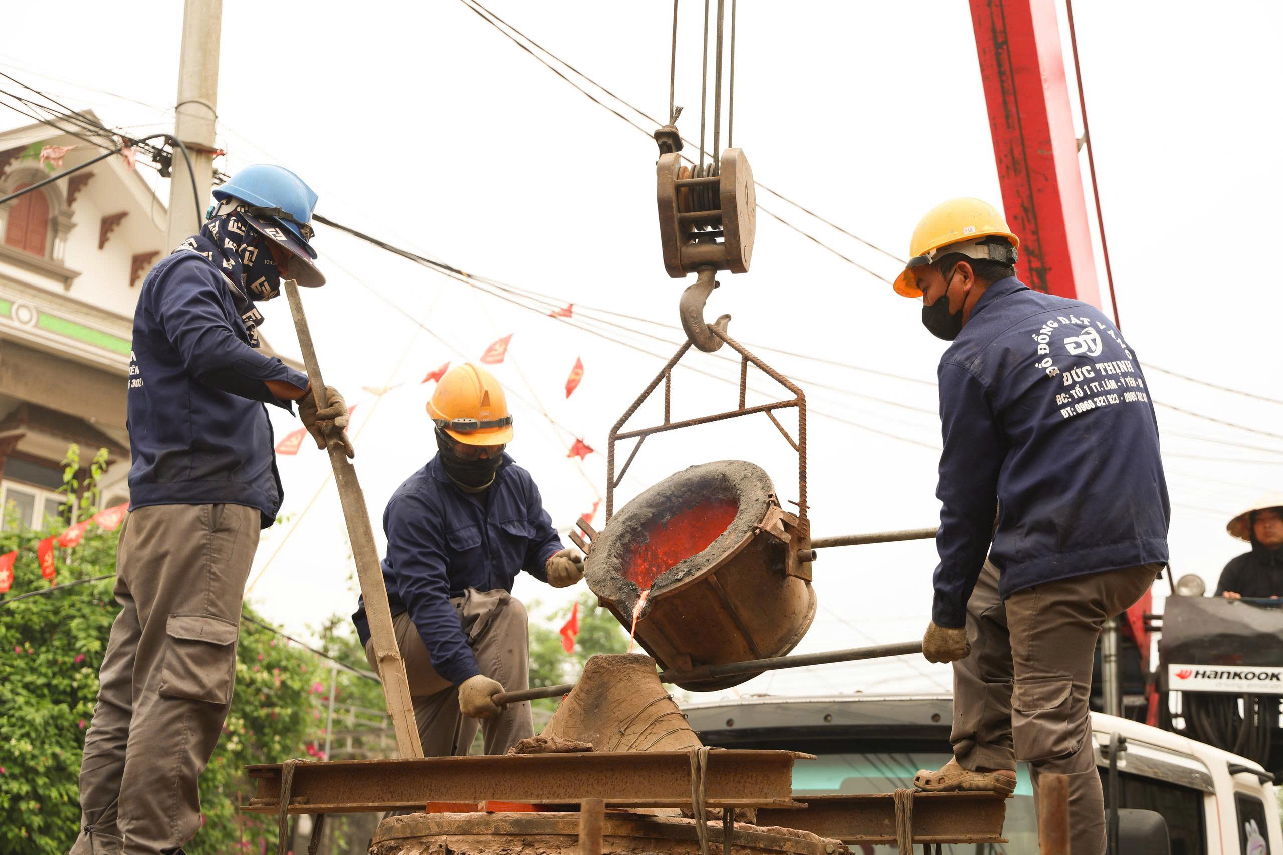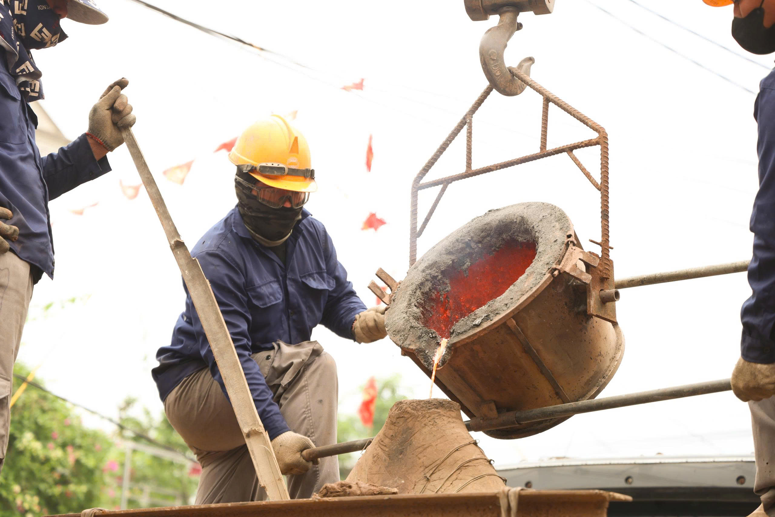 Với tấm lòng thành kính, các đại biểu và Phật tử tín tâm đã dâng cúng kim loại bằng vàng, bạc vào dòng đồng đang được chảy vào khuôn đúc