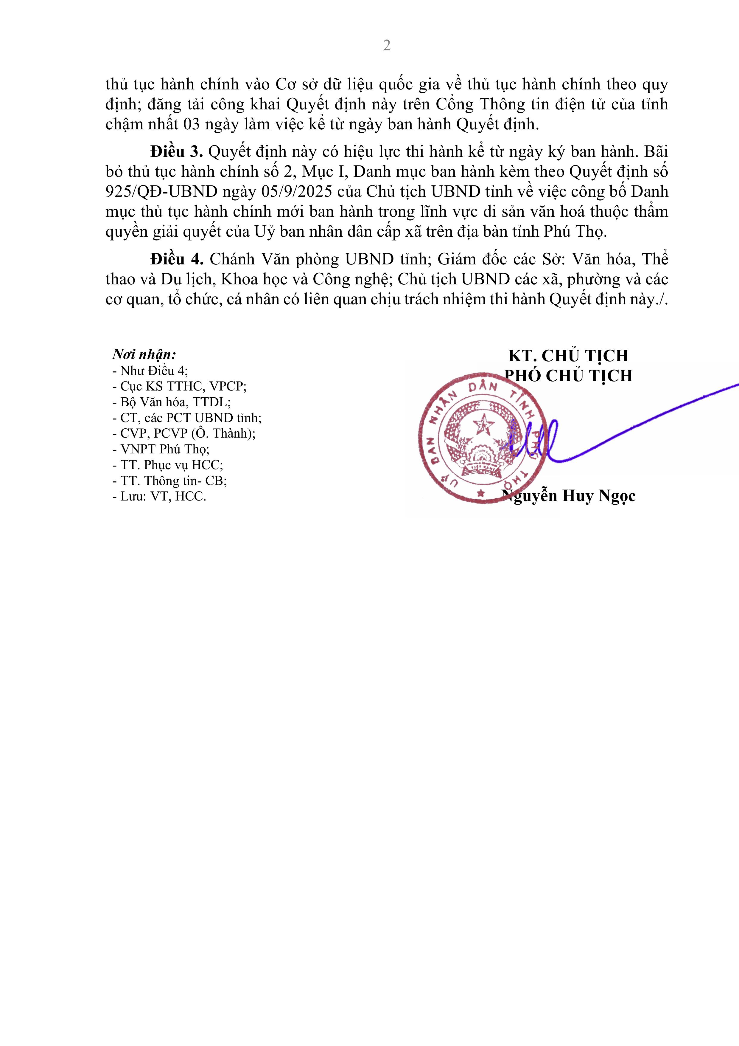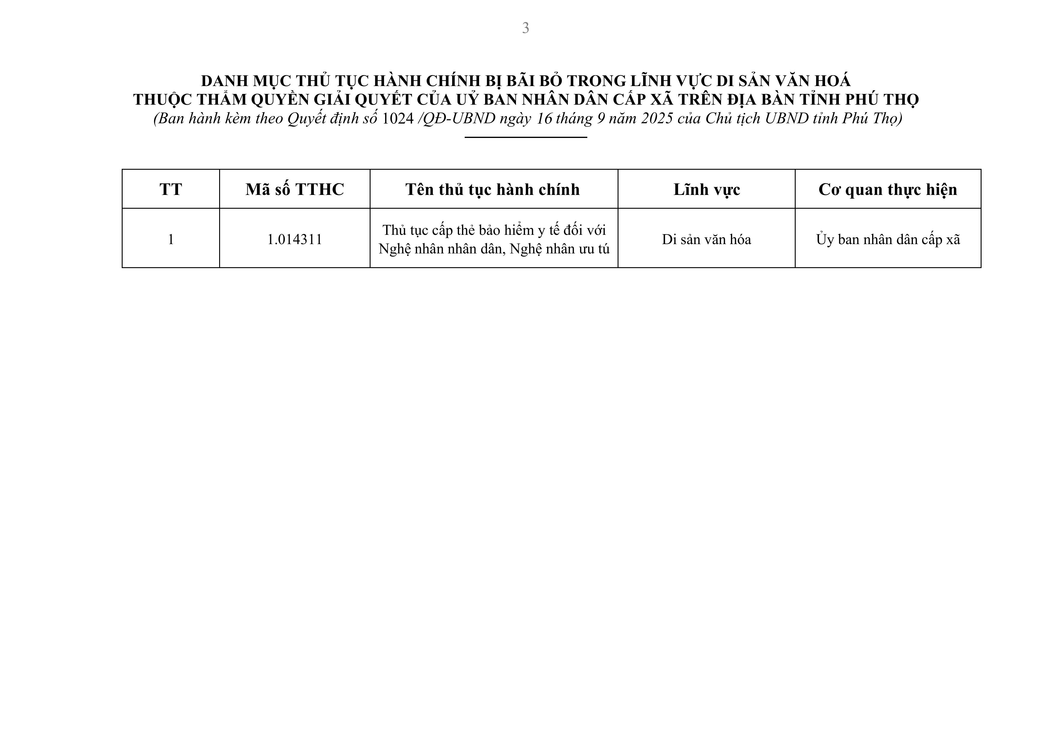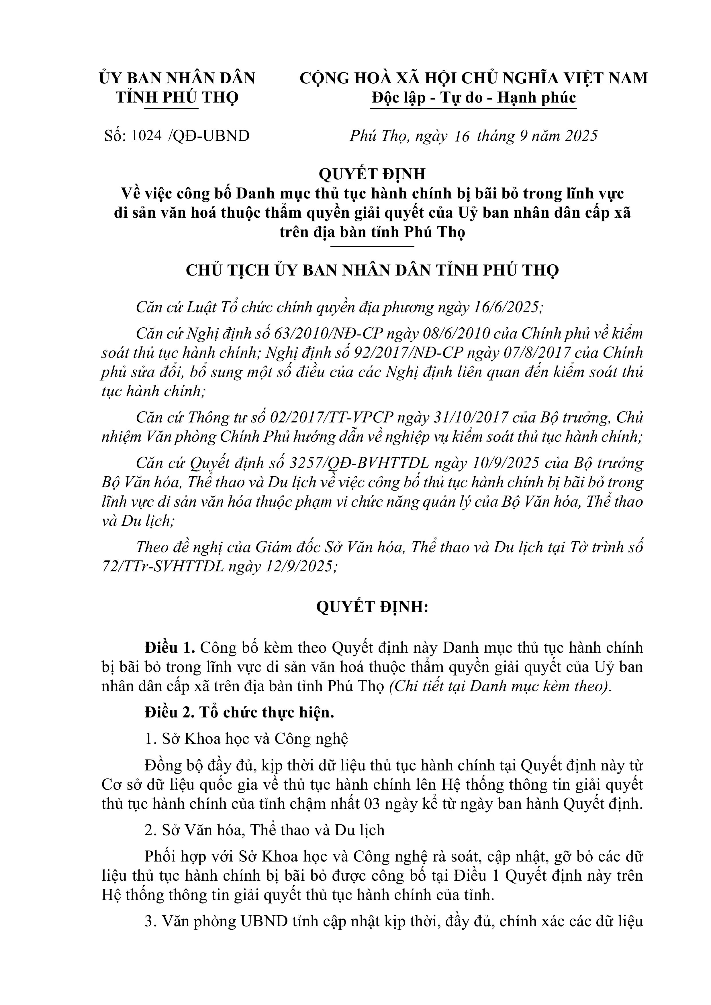 Công bố kèm theo Quyết định này Danh mục thủ tục hành chính bị bãi bỏ trong lĩnh vực di sản văn hoá thuộc thẩm quyền giải quyết của Uỷ ban nhân dân cấp xã trên địa bàn tỉnh Phú Thọ.