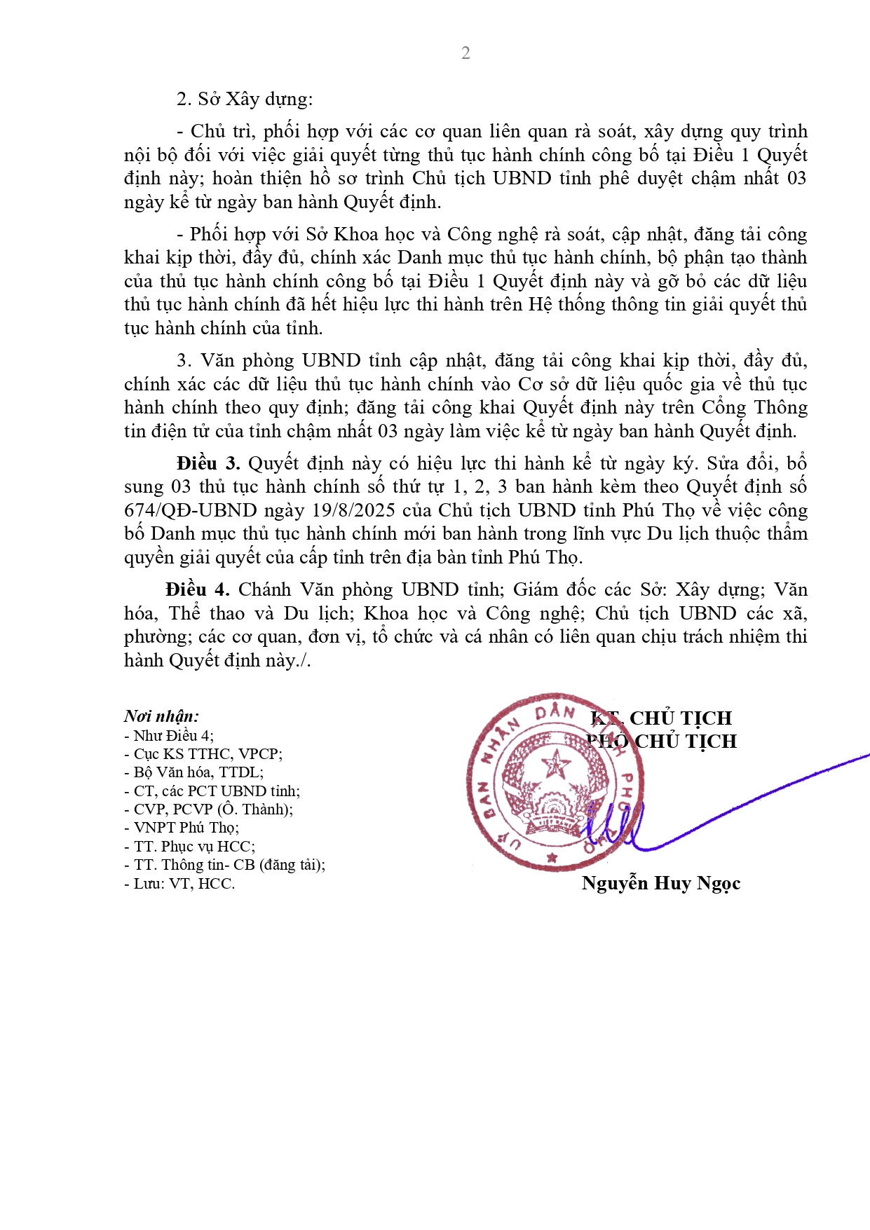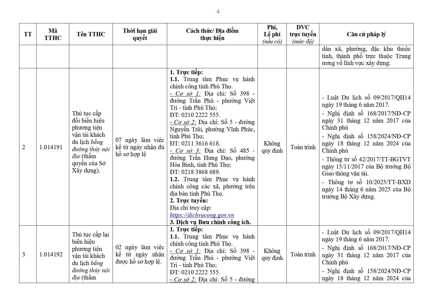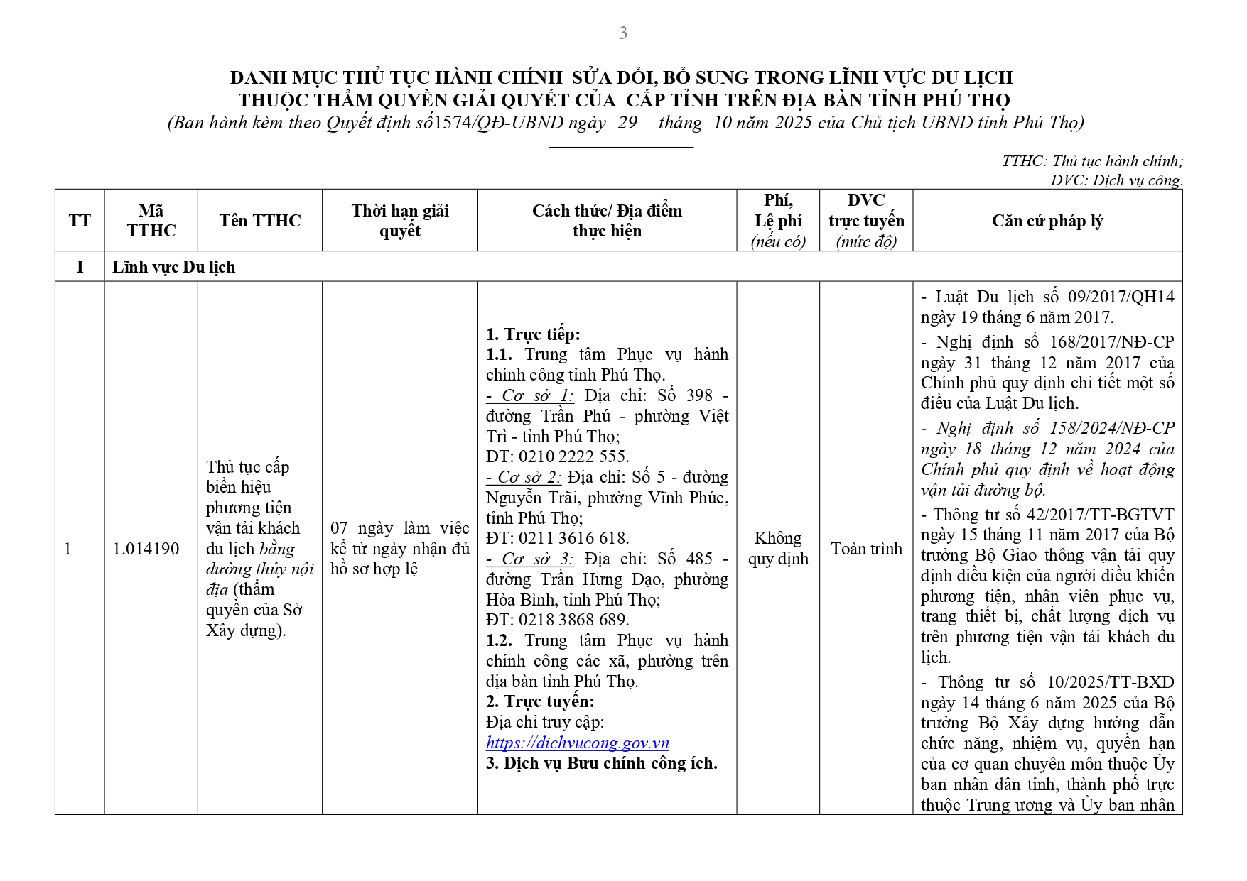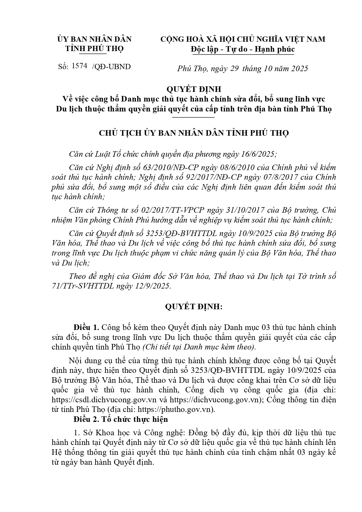 Công bố kèm theo Quyết định này Danh mục 03 thủ tục hành chính sửa đổi, bổ sung trong lĩnh vực Du lịch thuộc thẩm quyền giải quyết của các cấp chính quyền tỉnh Phú Thọ