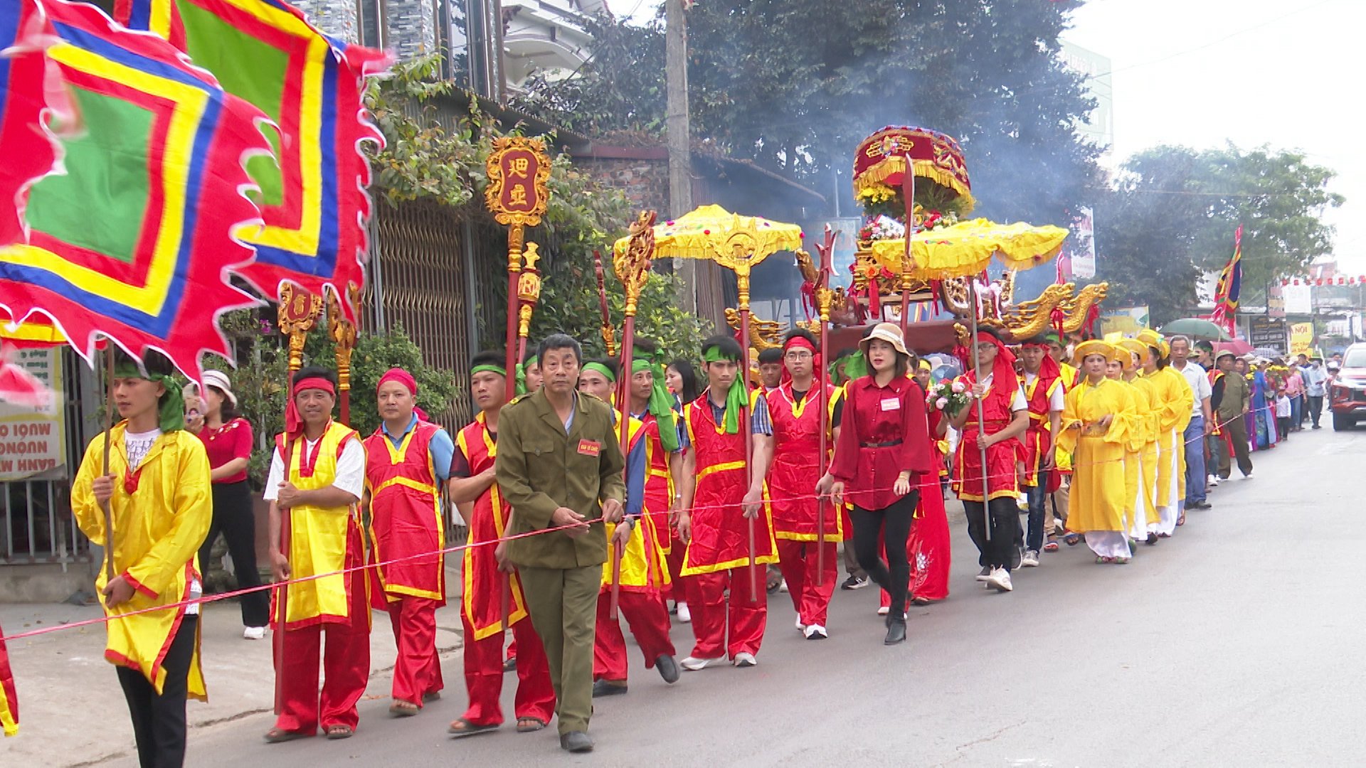 Trong tiếng trống, chiêng rộn rã, khắp xóm ngõ làng quê bừng lên niềm vui nhộn nhịp. Người người tấp nập đội lễ ra đền với tấm lòng thành kính để mong sẽ được thần che chở phù hộ.