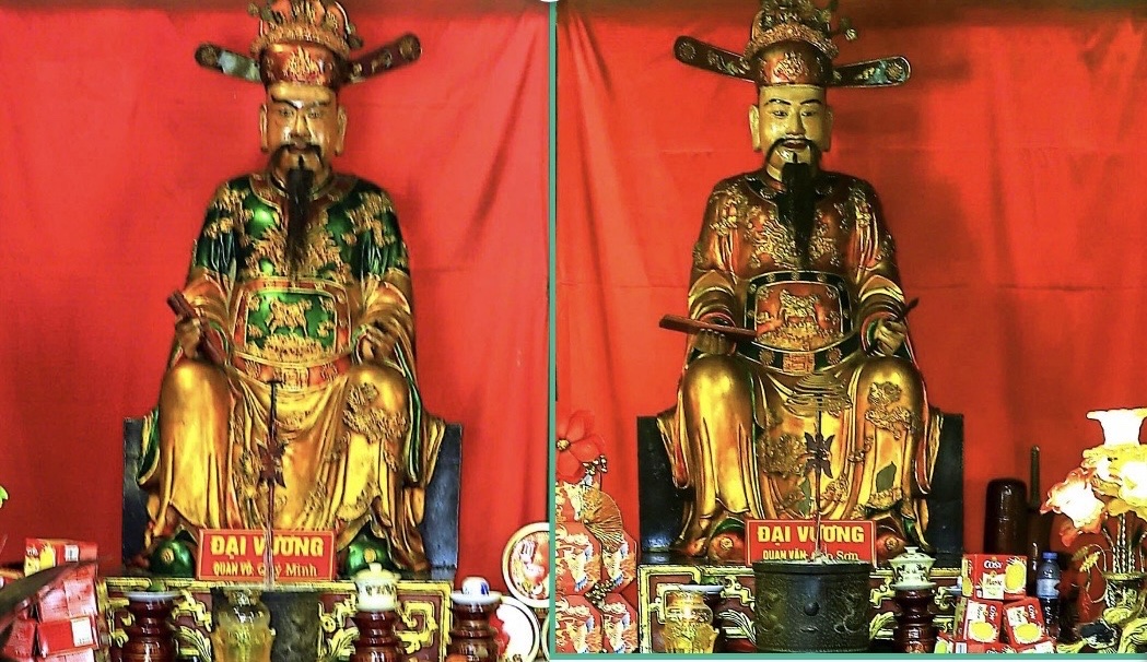 - Truyền thuyết về Cao Sơn, Quí Minh: Thời Hùng Vương thứ 17, ở Hồng Châu (sau đổi làm Hải Vương), có người họ Nguyễn tên huý là Tùng, lấy bà Lê Thị Điên, người cùng châu. Vợ chồng ông ấy vốn lấy nghề chặt củi mưu sinh, hay làm việc thiện. Nhưng ông đã ngoài sáu mươi tuổi, vợ ông lúc đó cũng ngoài bốn mươi mà vẫn muộn con trai. Một đêm, bà nằm mộng thấy hai ngôi sao rực sáng từ trên trời bay thẳng xuống bụng, bà liền ôm lấy mà nuốt, chợt giật mình tỉnh dậy bà kể với ông, ông nói: “Tất có điềm lành”. Từ đó bà có mang, vào ngày 3 tháng Giêng năm Nhâm Dần, sinh hạ được một bào thai nở ra hai con trai, thiên tư đĩnh ngộ, dáng mạo khôi kỳ ông rất yêu mến, nghĩ rằng “phúc hữu trùng lai”, thật trời đã ban cho nuôi nấng. Thực khó phân biệt ai là anh ai là em, bèn đặt tên người thứ nhất là Cao Sơn, người thứ hai là Quý Minh. Ngày qua tháng lại, hai ông lên bảy thì theo học Lữ tiên sinh, đến năm mười sáu tuổi, thiên tư dĩnh dị, học lực tinh thông, thuộc lầu binh thư, tài văn năng võ, vạn kẻ khôn địch, đứng đầu trăm họ. Đến lúc hai ông vừa tròn hai mươi tuổi, cha mẹ đều về nơi chín suối, hai ông chọn nơi đất tốt làm lễ mai táng, cư tang ba năm. Ý trời chưa dứt tạo lập cơ nghiệp cho vua Hùng, Duệ Vương sinh hạ được hai mươi hoàng tử, sáu nàng công chúa, nhưng đều thân trôi chân sẩy, không có người lập đích, duy chỉ có hai nàng Công chúa, nàng thứ nhất gả cho Chử Đồng Tử ở làng Đa Hoà, huyện Đông An, phủ Khoái Châu, còn nàng Công chúa thứ hai là lá ngọc cành vàng, đúng lúc lương duyên đến kỳ đẹp nhưng chưa định chốn nào. Vua truyền dựng lầu ở cửa thành Việt Trì, chiếu truyền các đạo, châu, huyện trong thiên hạ cử kẻ sĩ hiếu liêm, hiền lương phương chính, là thần dân có tài văn võ, đức độ hơn người đến ứng tuyển, vua sẽ gả Công chúa và truyền ngôi cho. Ngay hôm chiếu thiên tử truyền đi, người trong thiên hạ bốn bể lũ lượt kéo đến lầu, ngựa xe nườm nượp, văn bút như long xà, sao xa, trận võ mở mà hổ báo kinh hồn, dậy truyền đất trời. Khi ấy đạo Hồng Châu cử hai ông ứng tuyển. Kịp đến, khi vua thấy hai ông đối tài văn võ nghệ thực kẻ sĩ “nhất năng nhất nghệ”, bèn phong Cao Sơn làm chức “Đô chỉ huy sứ Tả tướng quân” phong Quý Minh vào chức “Đô chỉ huy sứ Hữu tướng quân” hai ông liền bái nhận quan tước, thế nhưng việc lương duyên vẫn chưa có kẻ xứng đáng. Sau có Tản Viên Sơn Thánh họ Nguyễn, huý là Tùng ở động Lăng Sương, huyện Thanh Châu, phủ Gia Hưng, đạo Sơn Tây là anh em đồng tông với hai ông, có nhiều phép lạ, thông thiên triệt địa, diệu thuật đổi nước dời non, Vua cho là bậc nhân tài đệ nhất trong thiên hạ, bèn gả công chúa và nhường ngôi cho Sơn Thánh. Khi đó chúa nước Ai Lao họ Thục, tên Phán, vốn dòng dõi vua Hùng cai trị ở Ai Lao, đổi làm họ Thục. Nay nghe tin Duệ Vương tuổi đã cao, lại nhường ngôi cho Phò mã liền thừa thế nổi lên cầu viện lân bang đem mười vạn tinh binh, tám ngàn cỗ ngựa, chia làm năm đạo cùng tiến đến xâm phạm bờ cõi nước ta. Tin trận cấp báo, một ngày năm lượt, Duệ Vương lấy làm lo lắng, bèn triệu Sơn Thánh đến hỏi kế. Sơn Thánh tâu rằng: “Bệ hạ uy đức khắp trời biển, nay nước phú binh cường, lại có lòng người phụ giúp giáng nhiều anh tài như Cao Sơn, Quí Minh, ngoài ra có nhiều Sơn, Thần thuỷ thần thường xuyên xuất hiện, cớ chi Bệ hạ phải lo lắng. Thần xin Bệ hạ cử hai anh em họ làm Tướng tuần phòng các đạo và các vùng sông Đáy, sông Đà, sông Chảy, sông Lô để chấn áp và phòng trị bất trắc. Thần xin đảm đương việc nặng nhọc thay vua, chọn tướng có tài, thần còn có thần thư, linh trượng, ước pháp dị kỳ, giặc Thục không quá một ngày sẽ bình". Vua nghe rất mừng bèn triệu hai ông lãnh năm nghìn quân đi trước đến các đạo. Hai ông liền bái tạ lãnh binh xuất trận. Hai ông tiến quân đến đạo Kinh Bắc, giặc Thục đóng đồn tại Sóc Sơn, cùng với chư tướng đại chiến một trận. Binh Thục đại bại trốn chạy, chém chính tướng và tì tướng vài ngàn, thu hoạch khí giới cùng ngựa nhiều không kể xiết. Từ đó thiên hạ thanh bình, nước nhà vô sự. Sơn Thánh bèn dâng biểu tấu triều đình, Vua bèn ban chiếu hồi triều, ông phụng mệnh trở về và Vua mở yến tiệc lớn chúc mừng, gia phong các cấp tướng sĩ. Hai ông bái tạ trở về, đến ngày mồng 2 tháng 11 hai ông đang ngồi trong bỗng thấy trên trời có hai đám mây vàng như hình dải nhiễu lao thẳng vào trong doanh trại rồi hai ông bay theo đám mây, hai ngài Cao Sơn và Quý Minh cùng bay đến phía đông huyện Thọ Xương thì hoá (đó là ngày 10 tháng 11). Trong chốc lát trời quang mây tạnh trở lại, sỹ tốt, nhân dân, gia thân đều kinh hãi bèn làm biểu tấu về triều. Vua bèn cho lập miếu tế tự. Qua các đời đều được sắc phong mỹ tự, thần hiệu: Phong Cao Sơn Hiển ứng Đại v
