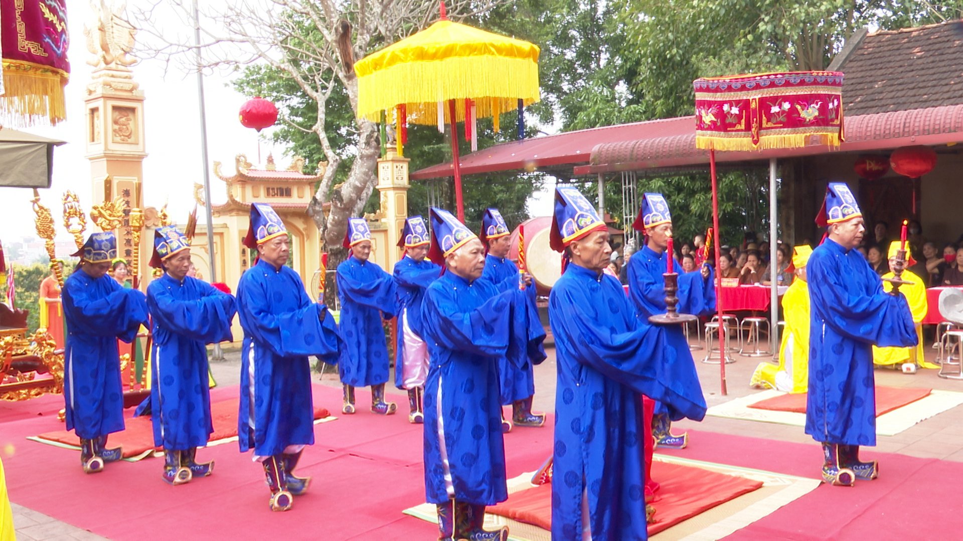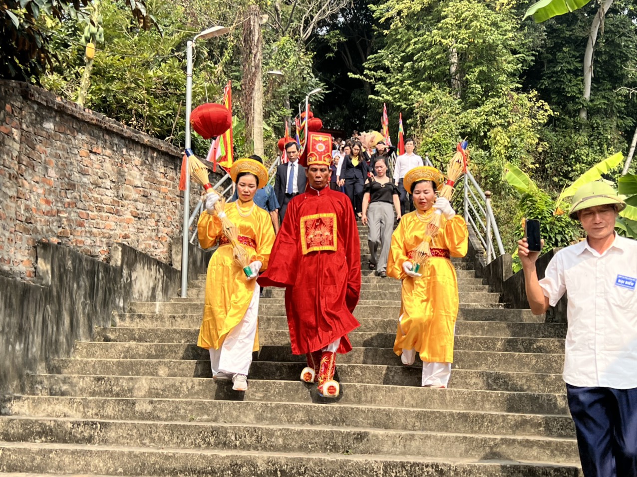 Chủ tế và thanh đồng rước cây bông từ Đình xuống