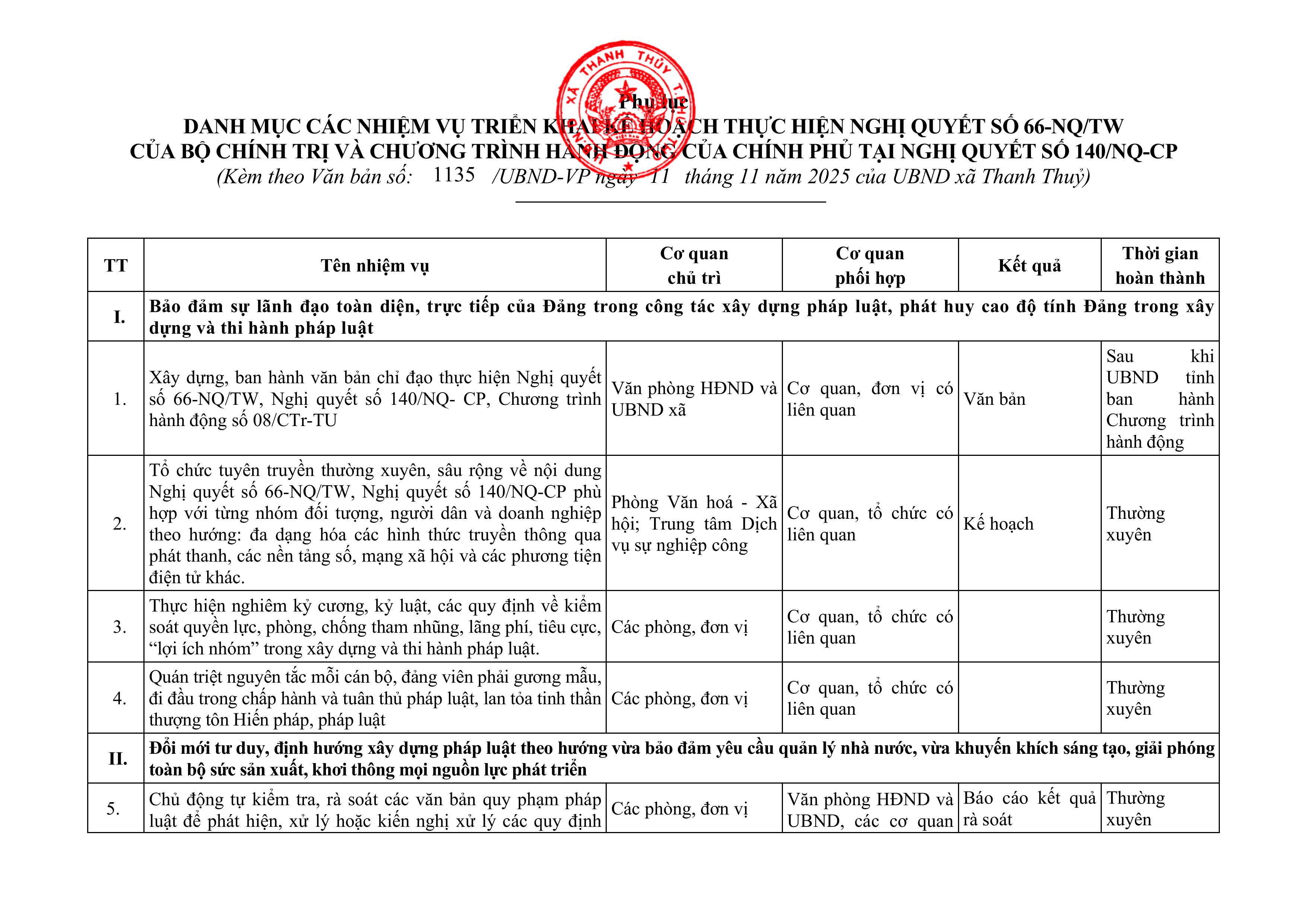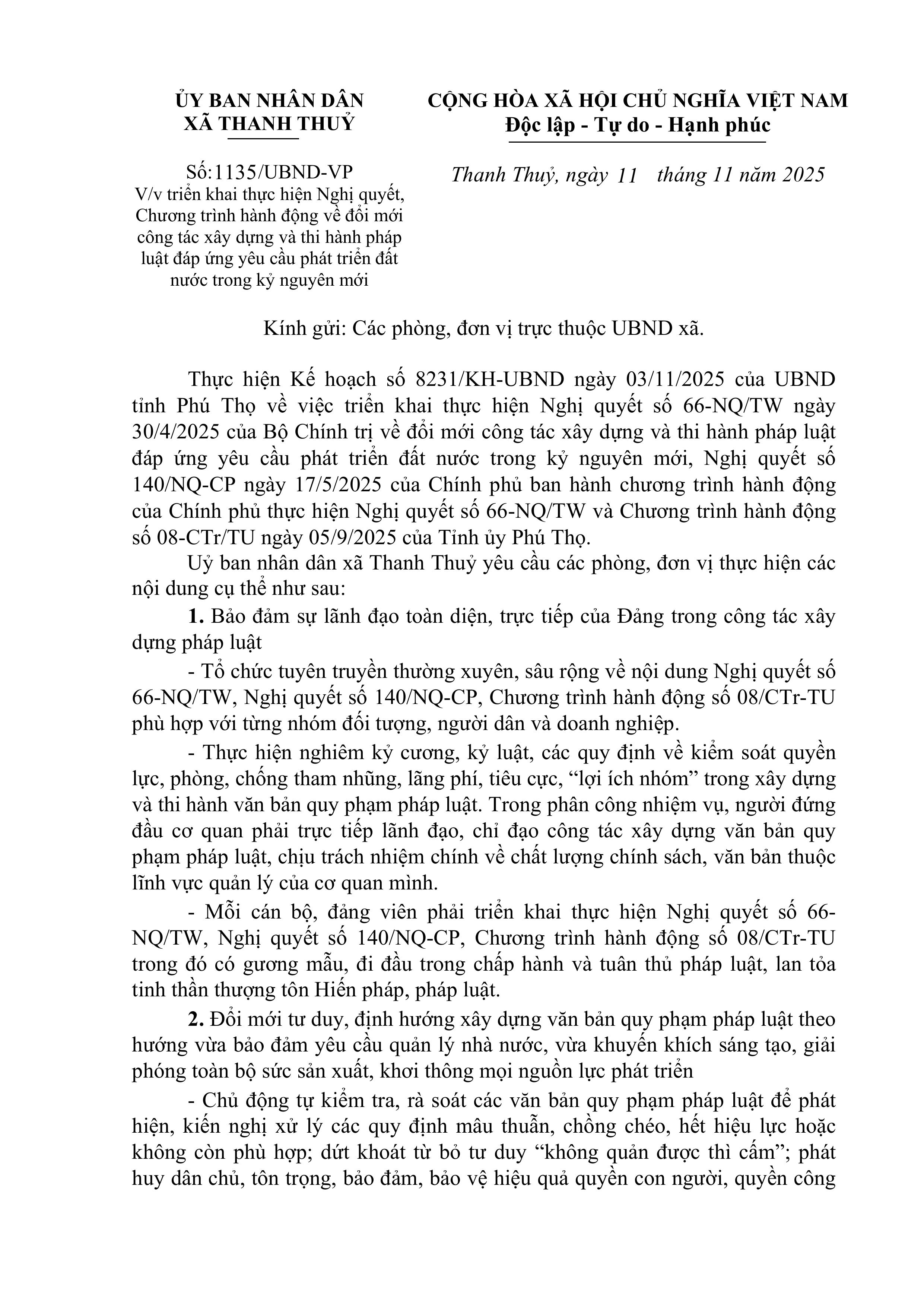 Thực hiện Kế hoạch số 8231/KH-UBND ngày 03/11/2025 của UBND tỉnh Phú Thọ về việc triển khai thực hiện Nghị quyết số 66-NQ/TW ngày 30/4/2025 của Bộ Chính trị về đổi mới công tác xây dựng và thi hành pháp luật đáp ứng yêu cầu phát triển đất nước trong kỷ nguyên mới, Nghị quyết số 140/NQ-CP ngày 17/5/2025 của Chính phủ ban hành chương trình hành động của Chính phủ thực hiện Nghị quyết số 66-NQ/TW và Chương trình hành động số 08-CTr/TU ngày 05/9/2025 của Tỉnh ủy Phú Thọ.