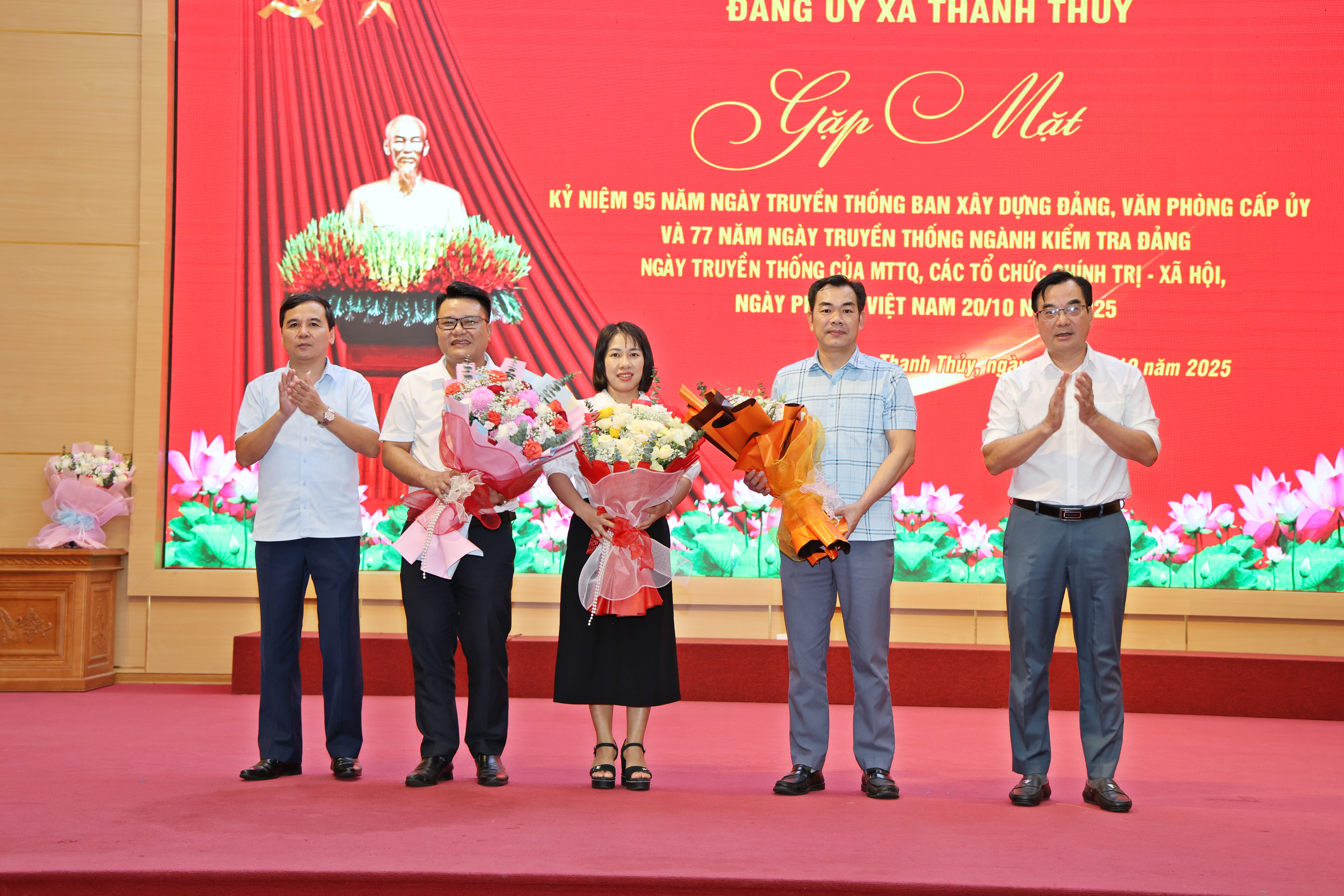 Ngày 14/10/2025, Đảng ủy xã Thanh Thuỷ tổ chức Chương trình gặp mặt kỷ niệm: 95 năm ngày truyền thống Ban xây dựng Đảng và Văn phòng cấp ủy, 77 năm ngày truyền thống ngành Kiểm tra Đảng. Ngày truyền thống của Mặt trận Tổ quốc và các tổ chức chính trị – xã hội và chào mừng Ngày Phụ nữ Việt Nam 20/10.