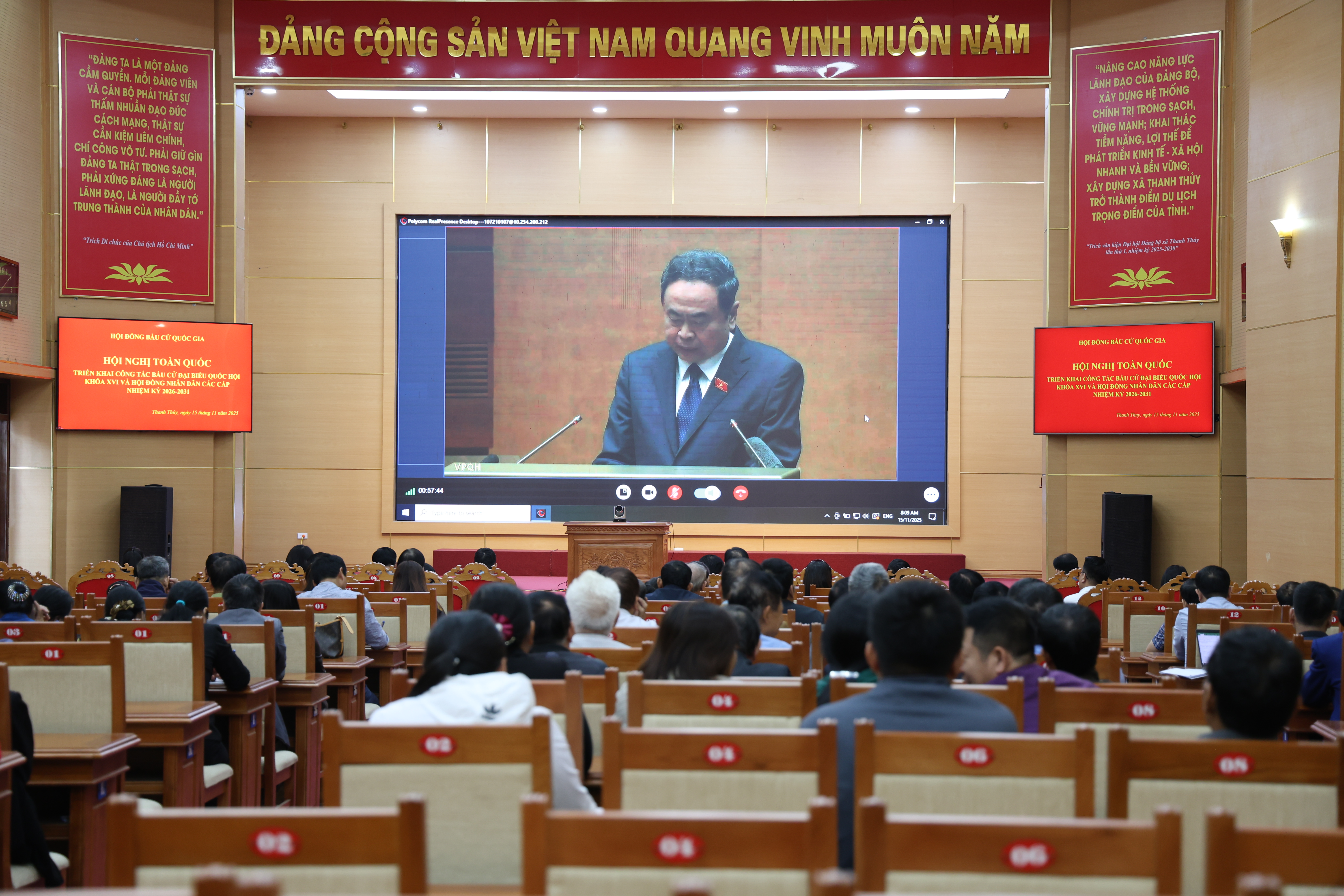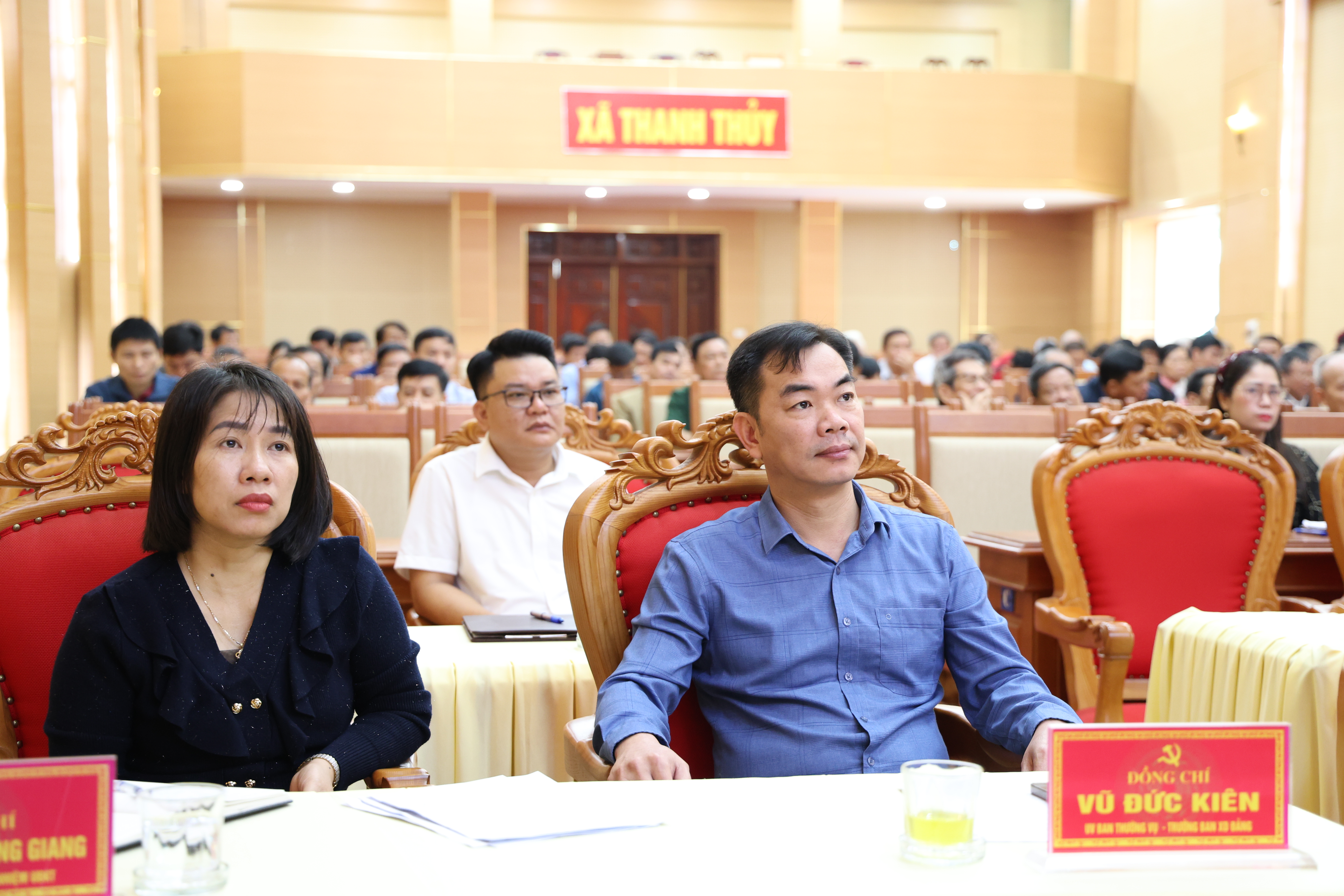 Dự tại điểm cầu xã Thanh Thuỷ có các đồng chí Trịnh Hùng Sơn - TUV, Bí thư Đảng uỷ, Chủ tịch Hội đồng Nhân dân xã; Vũ Minh Quốc - Phó Bí thư Thường trực Đảng uỷ; Nguyễn Minh Tân - Phó Bí thư Đảng uỷ, Chủ tịch UBND xã; Các đồng chí thành viên Ban Chỉ đạo, Uỷ ban bầu cử cấp xã; Lãnh đạo: Ban Xây dựng Đảng, Văn phòng Đảng ủy, Văn phòng HĐND và UBND xã; Các đồng chí Phó Ban chuyên trách HĐND xã; Bí thư, Phó Bí thư các chi đảng bộ trực thuộc Đảng ủy; và Trưởng ban công tác mặt trận, Trưởng khu dân cư, Trưởng các chi hội đoàn thể Khu dân cư trên địa bàn xã.