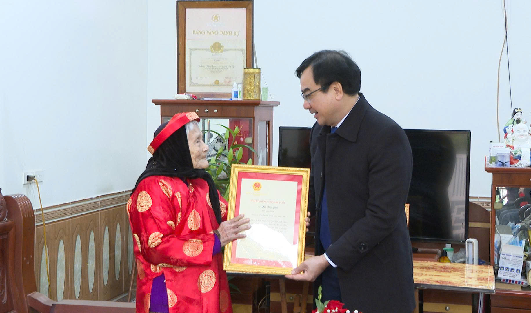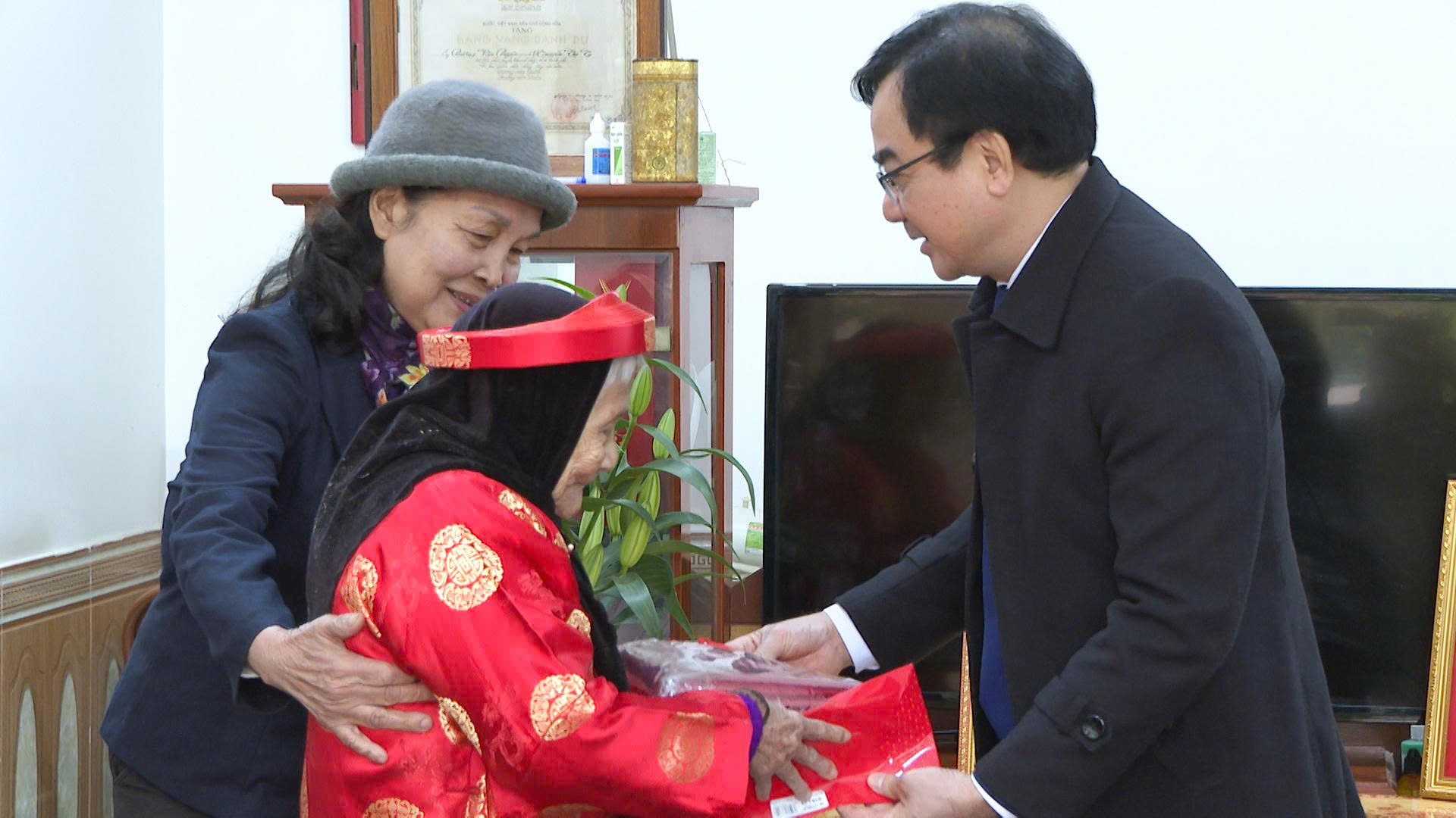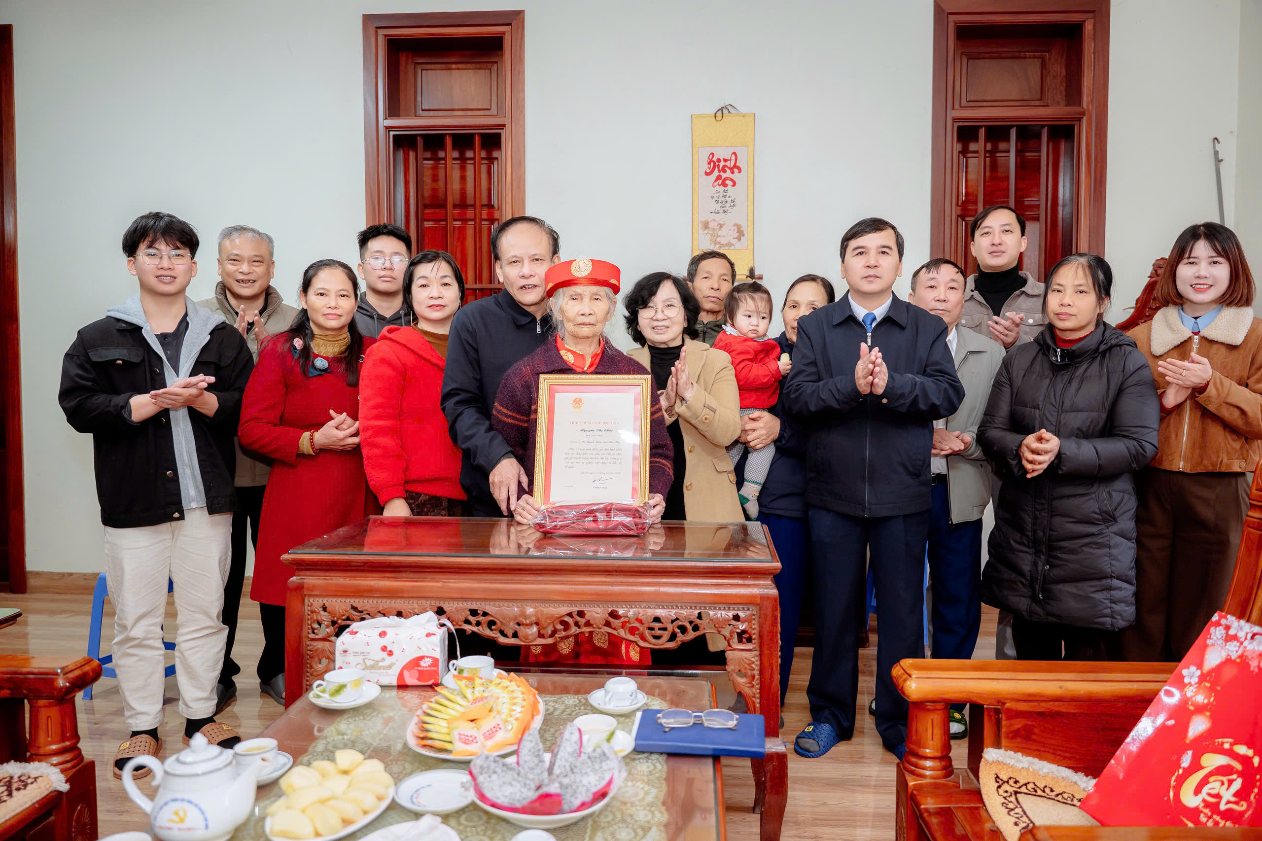 Đồng chí Vũ Minh Quốc - Phó Bí thư Thường trực Đảng uỷ thăm, chúc mừng cụ Nguyễn Thị Chức ở khu 3, thị trấn Thanh Thủy (cũ) - người cao tuổi tròn 100 tuổi