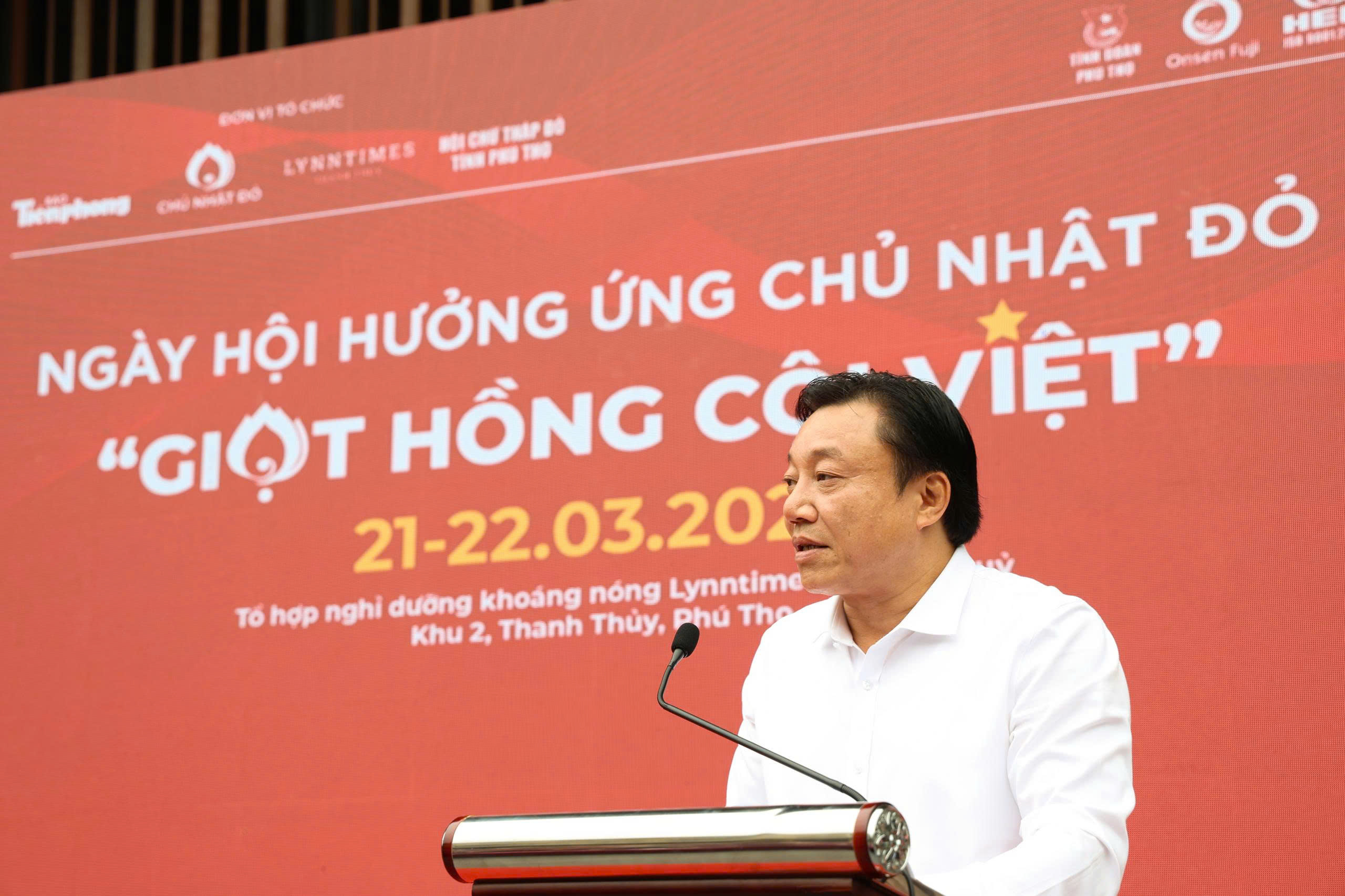 Phát biểu tại chương trình, đồng chí Phó Chủ tịch UBND tỉnh Nguyễn Huy Ngọc và lãnh đạo Báo Tiền Phong nhấn mạnh: Những năm qua, Phú Thọ luôn làm tốt công tác tuyên truyền, vận động, tổ chức hiến máu nên phong trào hiến máu tình nguyện của tỉnh được phát triển sâu rộng, thu hút đông đảo các tầng lớp Nhân dân tham gia, tạo sức lan tỏa sâu rộng trong cộng đồng. Cách đây 18 năm trước, xuất phát từ tình trạng khan hiếm máu diễn ra ở khắp cả nước, Báo Tiền Phong cho rằng phải làm điều gì đó và Chủ Nhật Đỏ ra đời. Năm đầu tiên, chỉ tiếp nhận được 96 đơn vị máu; đến nay, Chủ Nhật Đỏ đã lan tỏa ra các tỉnh, thành phố trong cả nước, trở thành lễ hội hiến máu ở nhiều địa phương và đã thu được hàng triệu đơn vị máu. Đây là lần thứ 3 Báo Tiền Phong phối hợp với các đơn vị tổ chức chương trình Chủ Nhật Đỏ tại Khu nghỉ dưỡng khoáng nóng 5 sao thuộc tổ hợp khách sạn Quốc tế Wyndham Lynn Time Thanh Thủy; ngoài thông điệp “Hiến máu cứu người - Sinh mệnh của bạn và tôi”, còn có một thông điệp về lan tỏa sự sẻ chia dòng máu lạc hồng của dân tộc được hòa quyện, đoàn kết. Thông qua chương trình, tinh thần sẻ chia hiến máu cứu người sẽ được lan tỏa mạnh mẽ trong cộng đồng trên địa bàn tỉnh Phú Thọ nói chung và xã Thanh Thủy nói riêng, thu hút đông đảo tình nguyện viên tham gia, mang lại niềm hy vọng sống cho bệnh nhân và gia đình bệnh nhân cần máu.